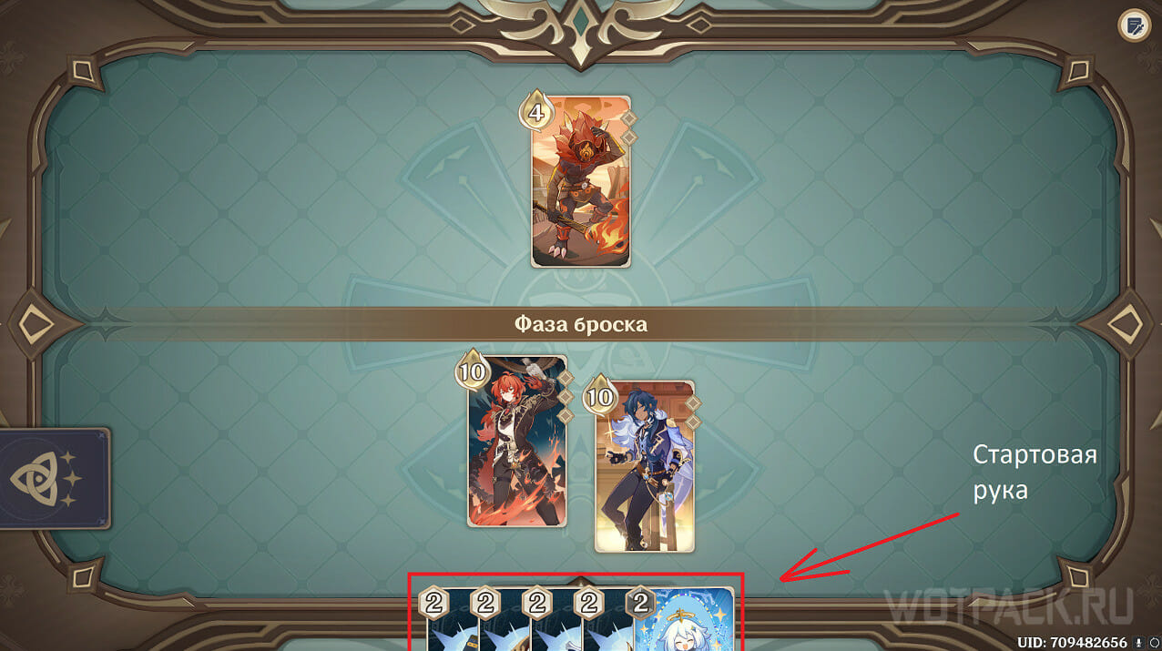 В начале каждой дуэли потребуется вытянуть из колоды 5 карт действий: из них формируется стартовая рука игрока. Чтобы просмотреть руку и раскрыть ее – нажмите на карты снизу: они поднимутся и сможете выбрать одну из них.