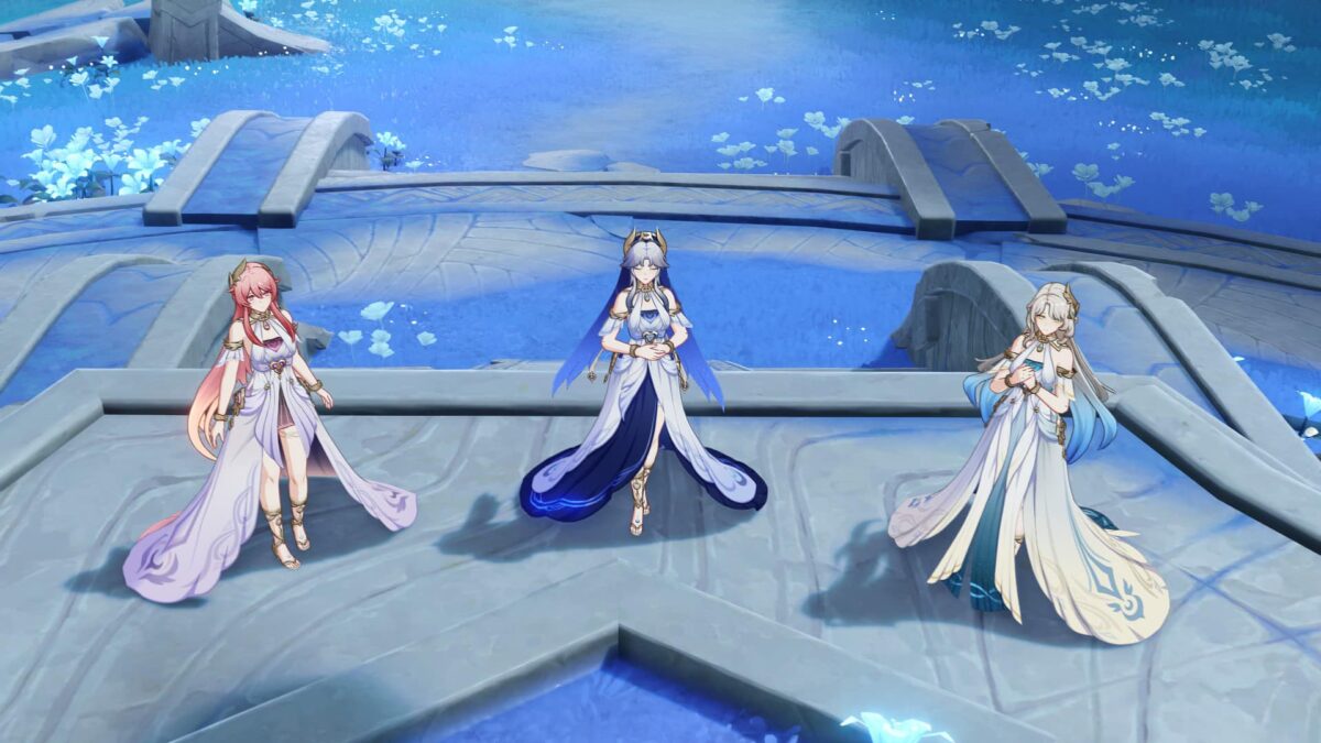 Перемещаясь в прошлое, Коломбина смогла встретиться с Тремя Лунами — Сонет (Радужной), Канон (Морозной) и Арией (Вечной). Богини заперты в темнице по воле изначального повелителя Тейвата, Владыки драконов Нибелунга. Узнав от «сестры» о будущем, они стараются помочь ей вернуться в настоящее и оказать сопротивление Дотторе, который создал третий искусственный Лунный светоч и стал Ложным божеством.