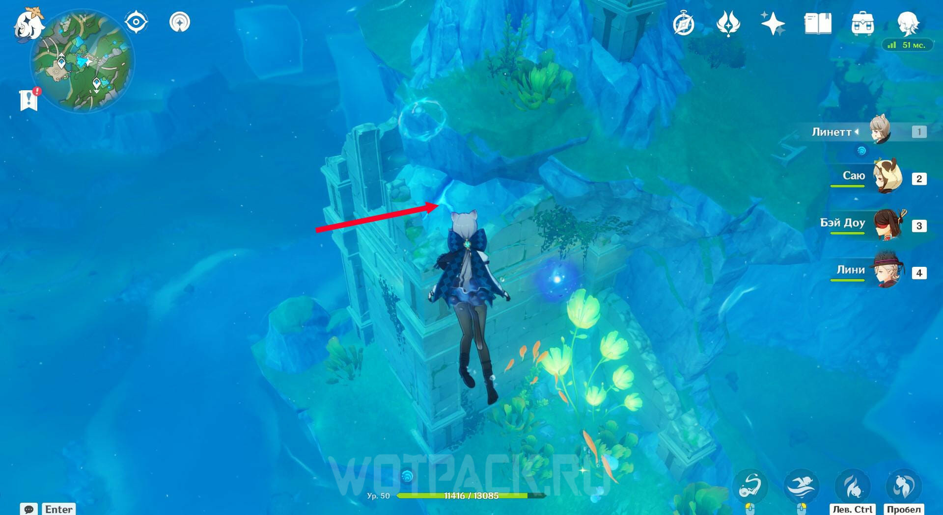 Получите навык ксенохромной медузы, плавающей поблизости, и разбейте камень в нижнем углу водоема. В нем находится таинственная руда, которую можно собрать.