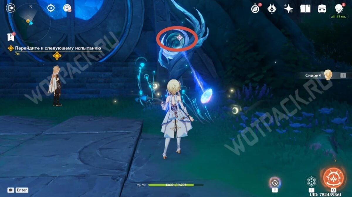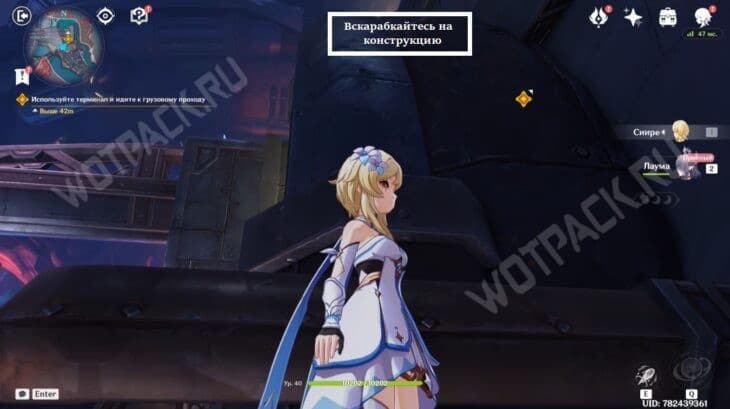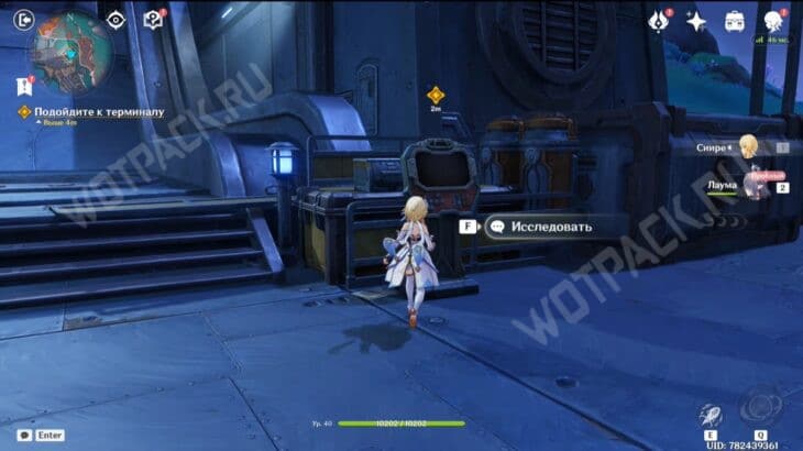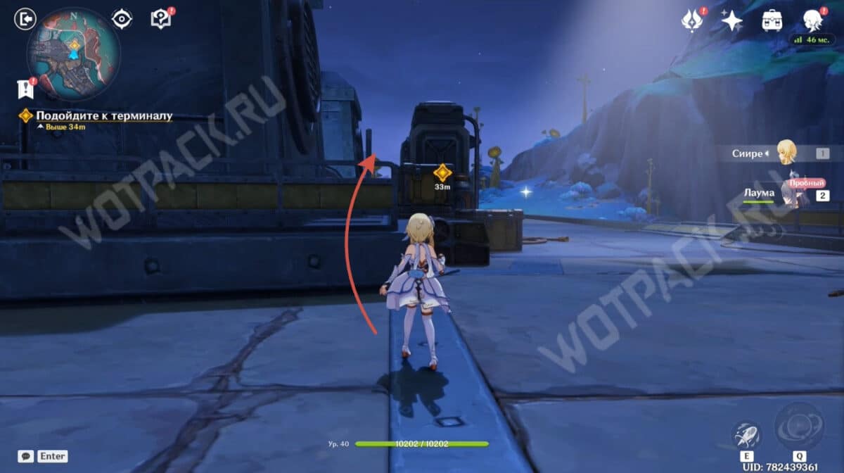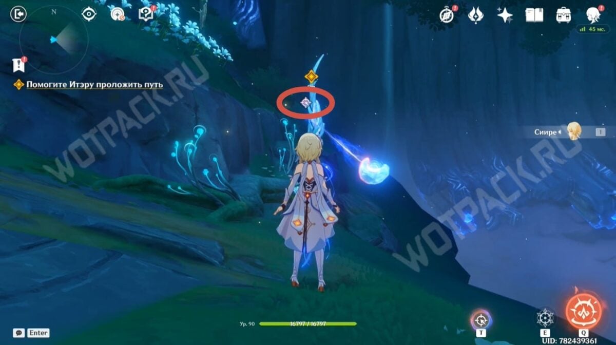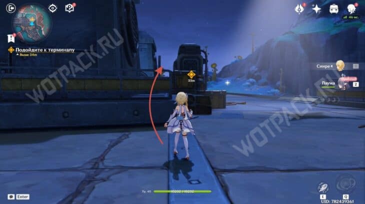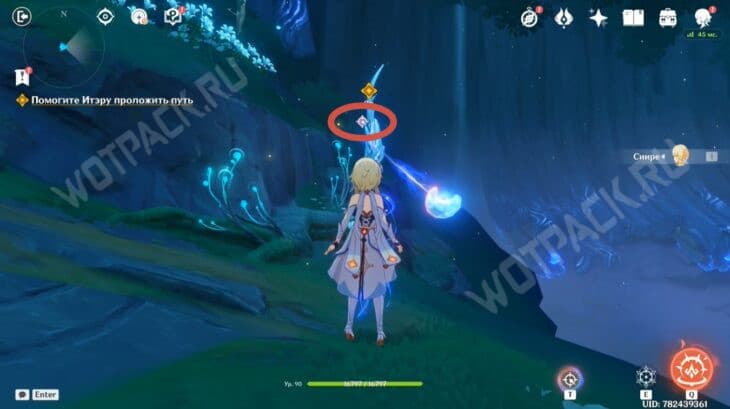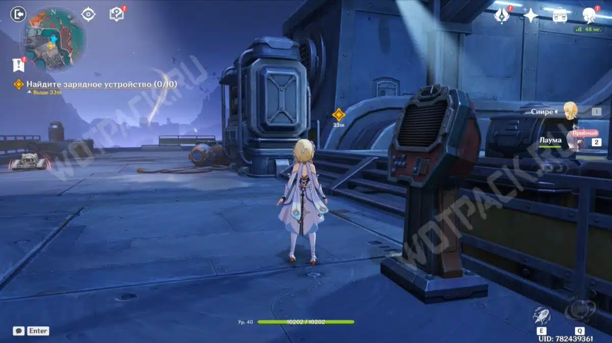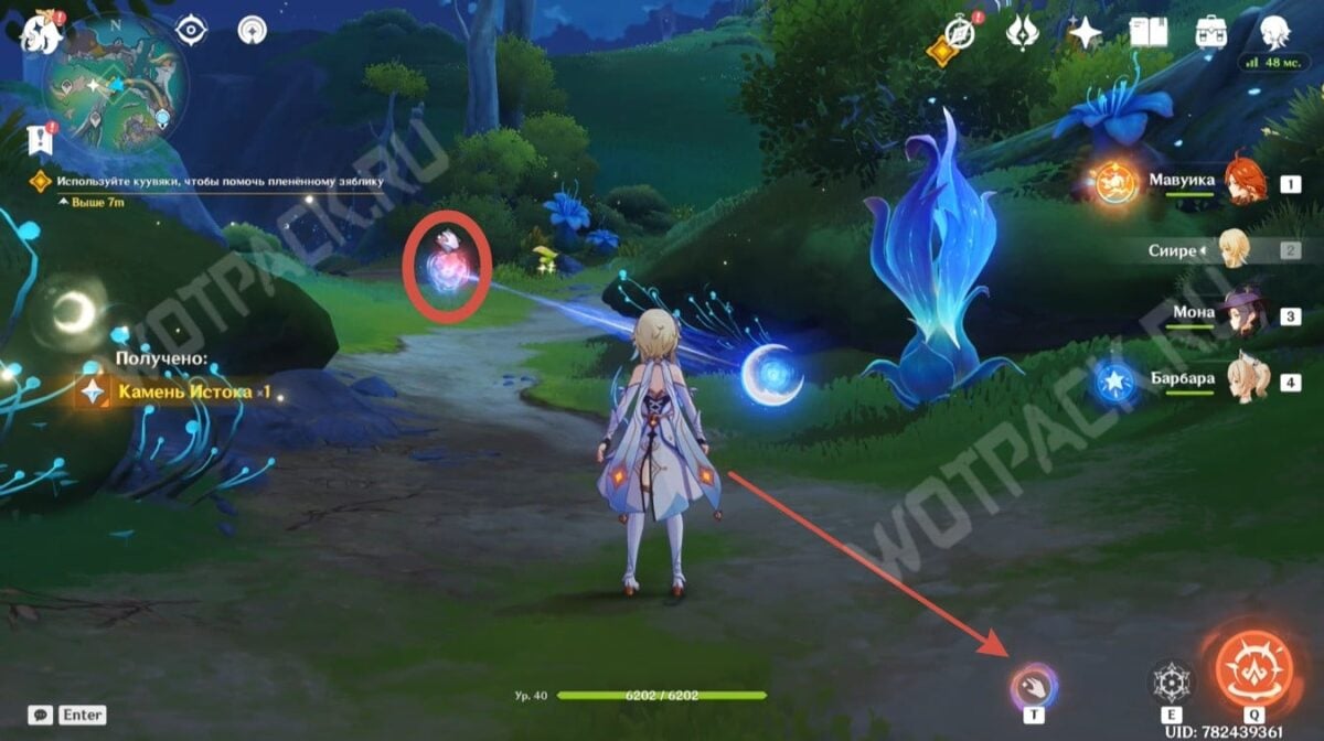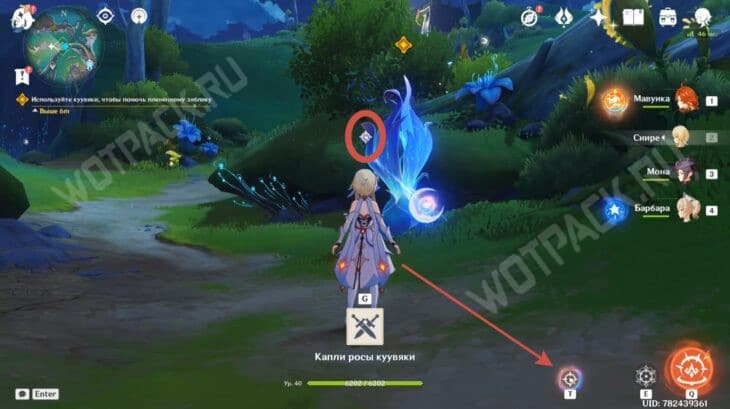 Затем помогите Люмин проложить путь (или Итэру). Для этого взаимодействуйте с каплей росы куувяки, как делали ранее при спасении зяблика (по умолчанию «Т»), и разместите её в отмеченной зоне — на специальном лунном приборе.