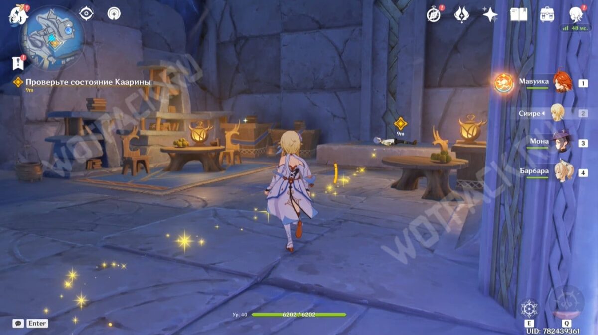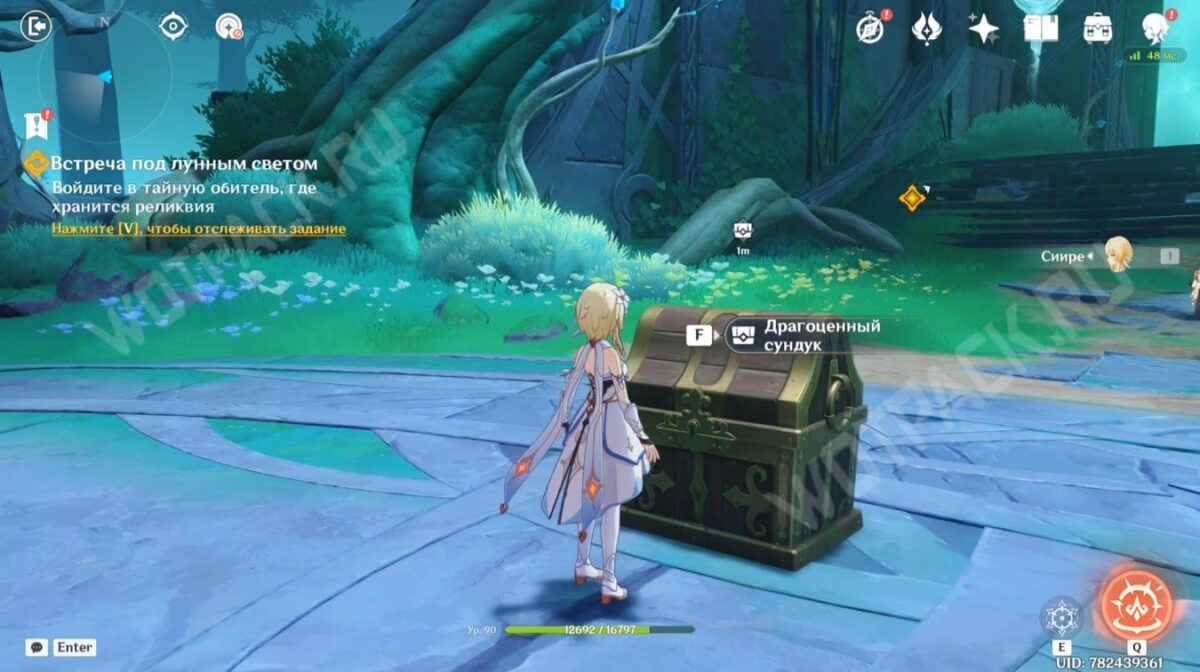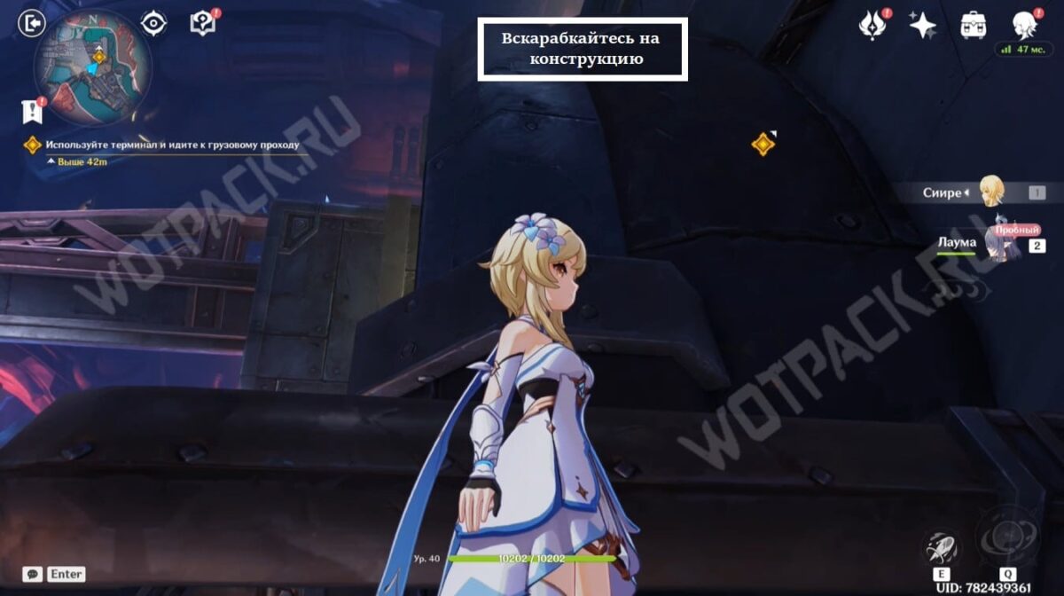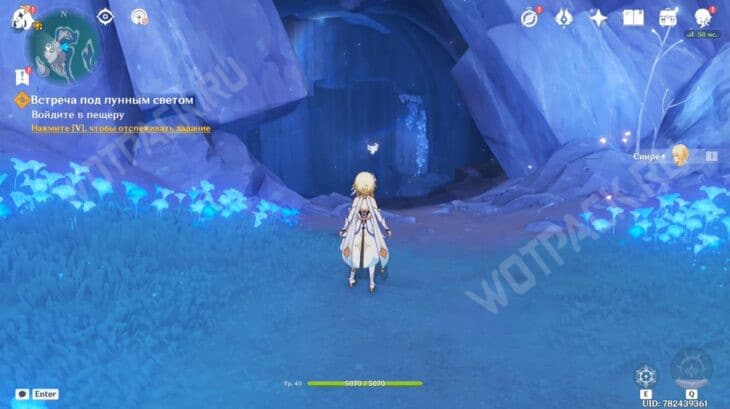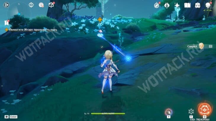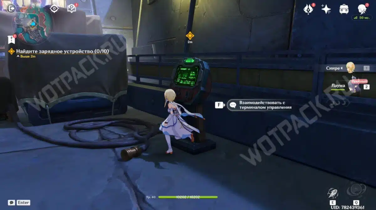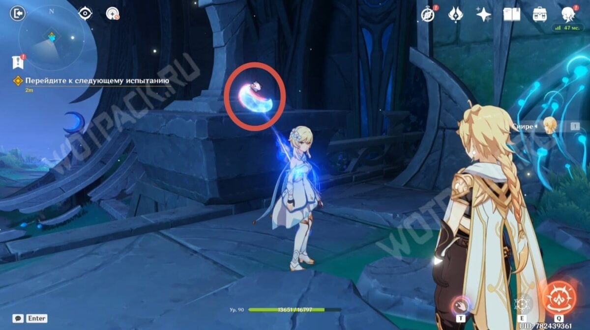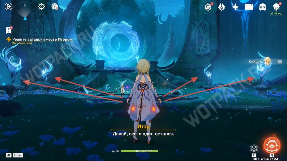 Затем помогите Люмин проложить путь (или Итэру). Для этого взаимодействуйте с каплей росы куувяки, как делали ранее при спасении зяблика (по умолчанию «Т»), и разместите её в отмеченной зоне — на специальном лунном приборе.