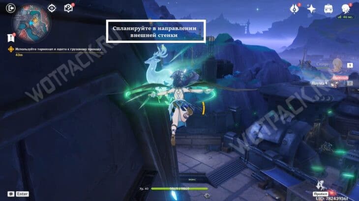 - Нажмите «Пробел» и совершите высокий прыжок, после чего экипируйте планер и пролетите в направлении второй платформы.