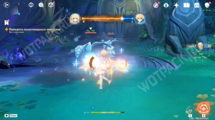Основное умение во время сражения — взрыв стихий (по умолчанию «Q»). Копите энергию, применяя базовые удары и навык, чтобы после провести мощную совместную атаку способностью. Повторите последовательность действий до трёх раз.
