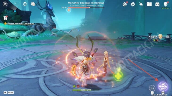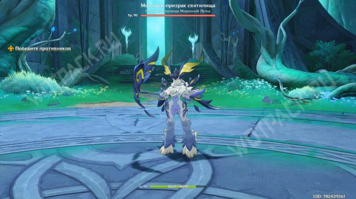 Поток выведет к арене, где должно состояться последнее испытание подземелья. Пройдите к стражу святилища Морозной Луны, Мотыльку-призраку святилища, чтобы сойтись в бою против монстра.