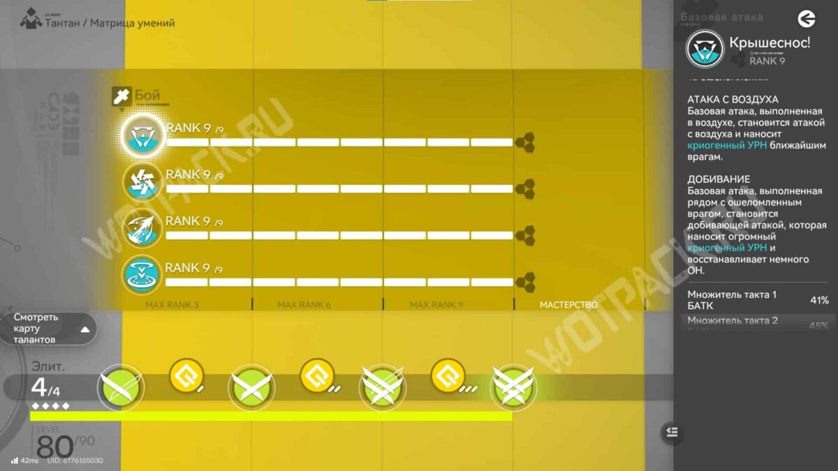 При сборке Тантан акцент делается на ее личном уроне за счет повышения основных характеристик: ловкость и сила. В ротации она активно использует боевой навык, который наносит больше всего повреждений, поэтому бонусы следует искать для этой способности. Среди вспомогательных статов полезны приросты к крио стихии и АТК.