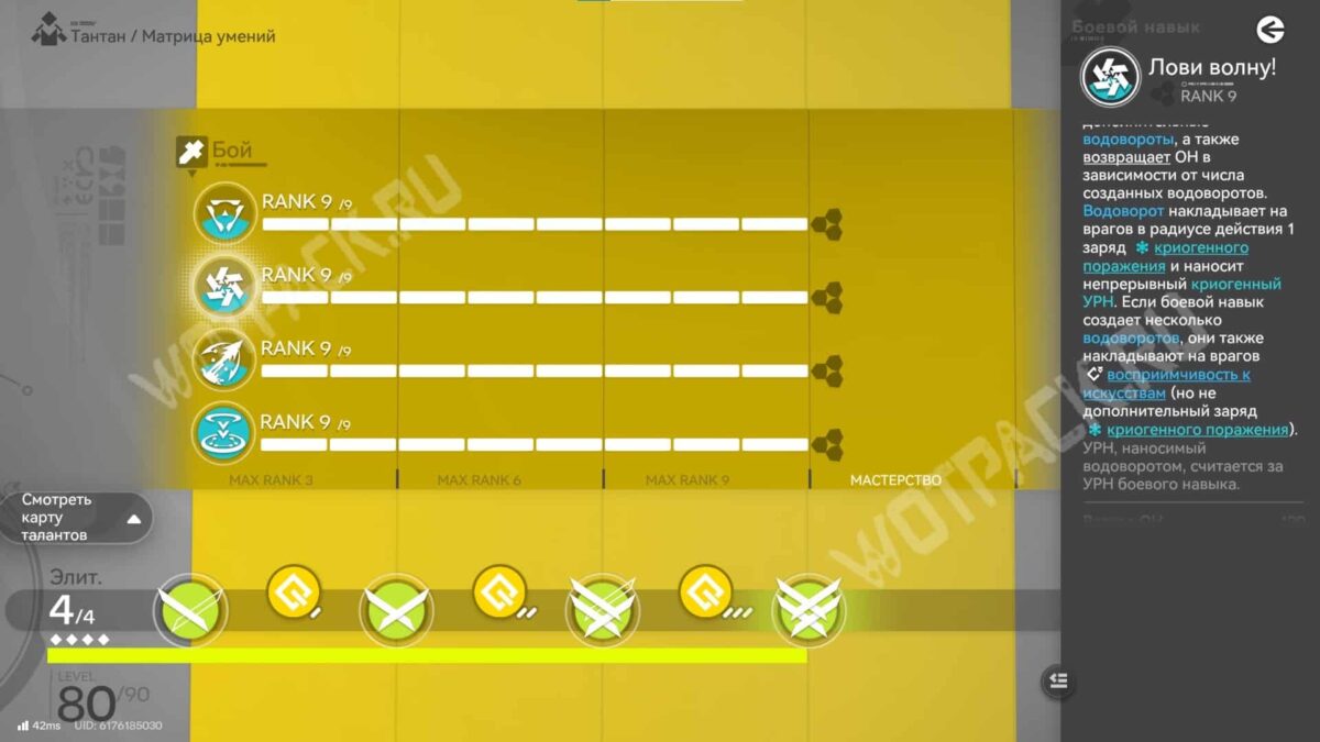 - Б/н «Лови волну» — основной источник DPS. При активации создается водоворот, накладывающий криогенное поражение, а при поглощении воронок их становится больше и враги получают восприимчивость к искусствам. Вдобавок возвращается немного ОН.