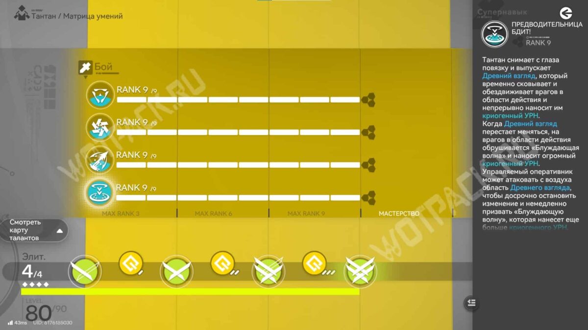Предводительница Тантан — гибкий персонаж, сочетающий функции поддержки, контроля и дополнительного урона. Она усиливает любые элементальные команды благодаря дебаффу, который повышает восприимчивость врагов, а максимально раскрывает потенциал в крио сборках за счет стабильного наложения зарядов ледяной стихии.