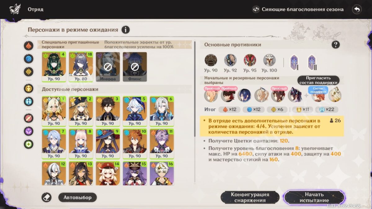 Для прохождения всех этапов на различных уровнях сложности требуется подготовить Гидро, Пиро и Гео героев для дальнейшего их распределения. В качестве эксклюзивных компаньонов добавлены персонажи с Лунными Реакциями, к которым невозможно применить карточки усиления из-за отличающейся стихии: Флинс, Инеффа, Нефер и Лаума.