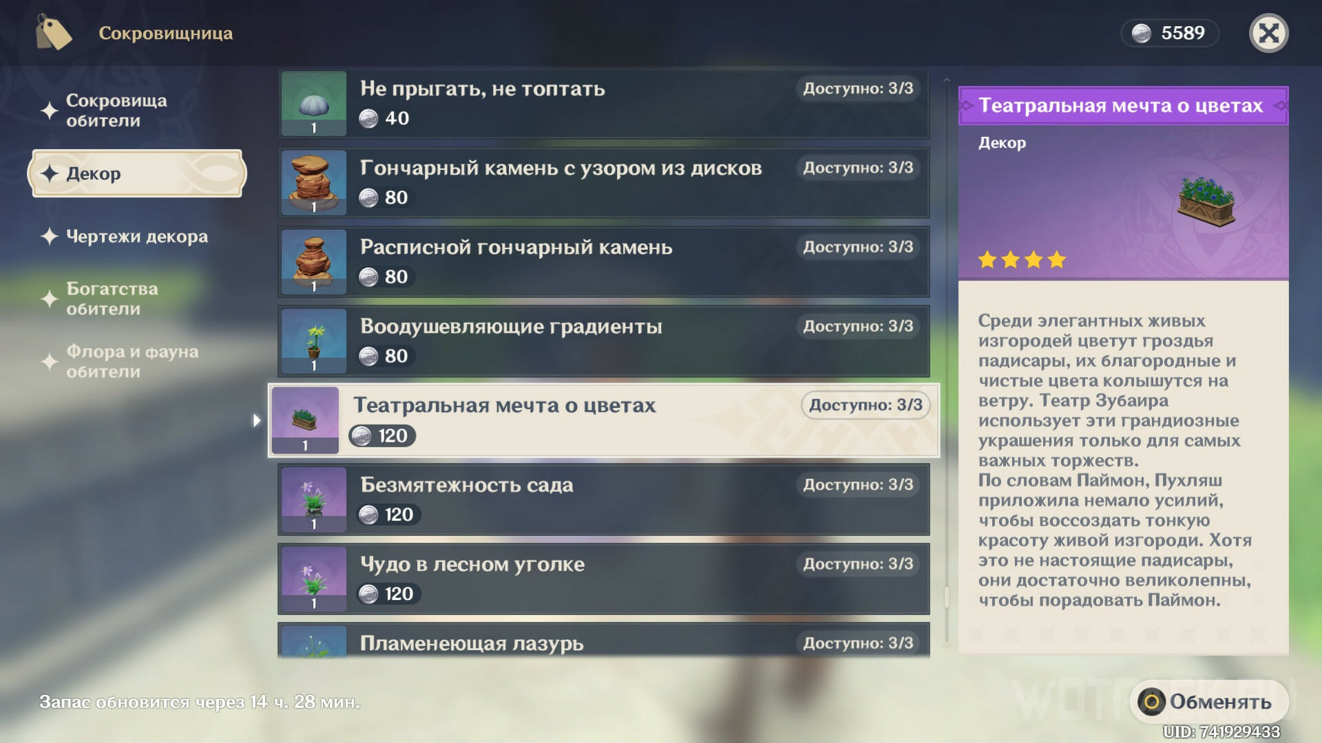 Купить Театральную мечту о цветах можно в магазине у духа Пухляша в своем Чайнике безмятежности. В диалоге с хранителем выберите вариант “Сокровищница”, чтобы перейти во внутренний магазин обители. Нужное украшение находится во вкладке “Декор”. Купить его можно за 120 монет чайника.