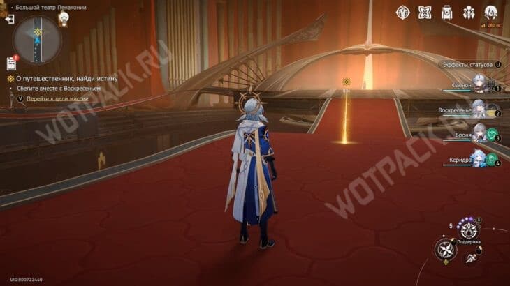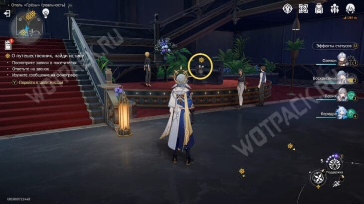Изучите странную картину, расположенную в центре комнаты Первопроходца. Автоматически переместитесь в отель «Грёзы» (реальность): отправляйтесь в вестибюль и выясните, что происходит, поговорив с наставниками и проводником — для этого пройдите по коридору вперёд.