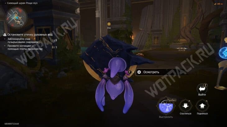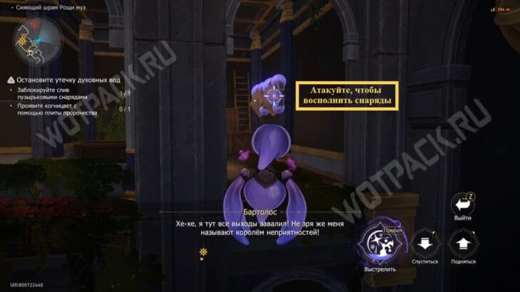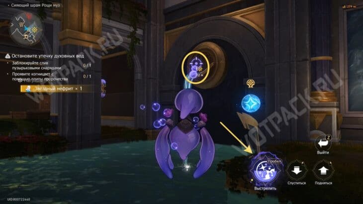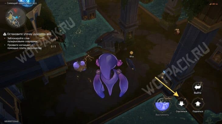Сместите точку обзора на слив и непрерывно нажимайте «Пробел» в направлении конструкции, чтобы заблокировать утечку. Если заряды заканчиваются, восполните их, выстрелив в пузырьковые сферы в форме щитов.