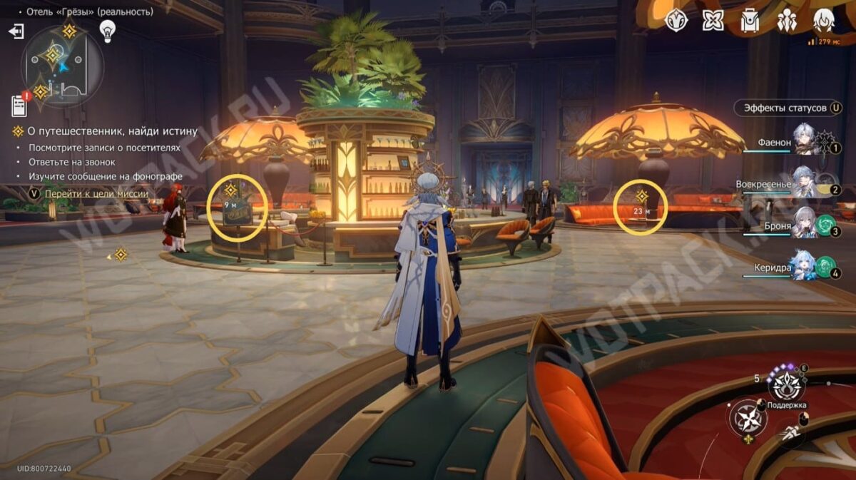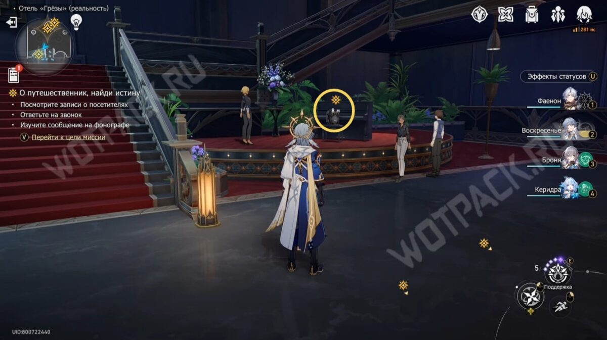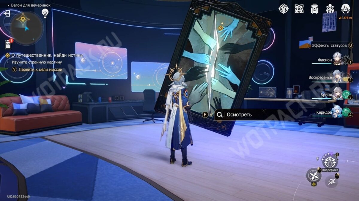 Изучите странную картину, расположенную в центре комнаты Первопроходца. Автоматически переместитесь в отель «Грёзы» (реальность): отправляйтесь в вестибюль и выясните, что происходит, поговорив с наставниками и проводником — для этого пройдите по коридору вперёд.