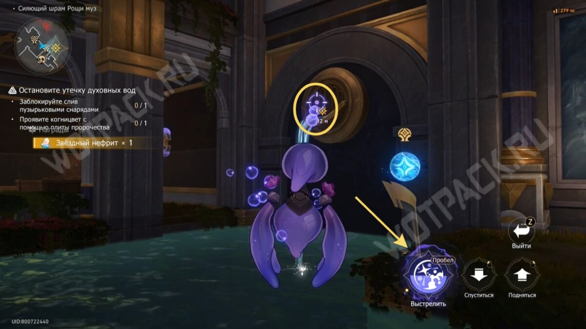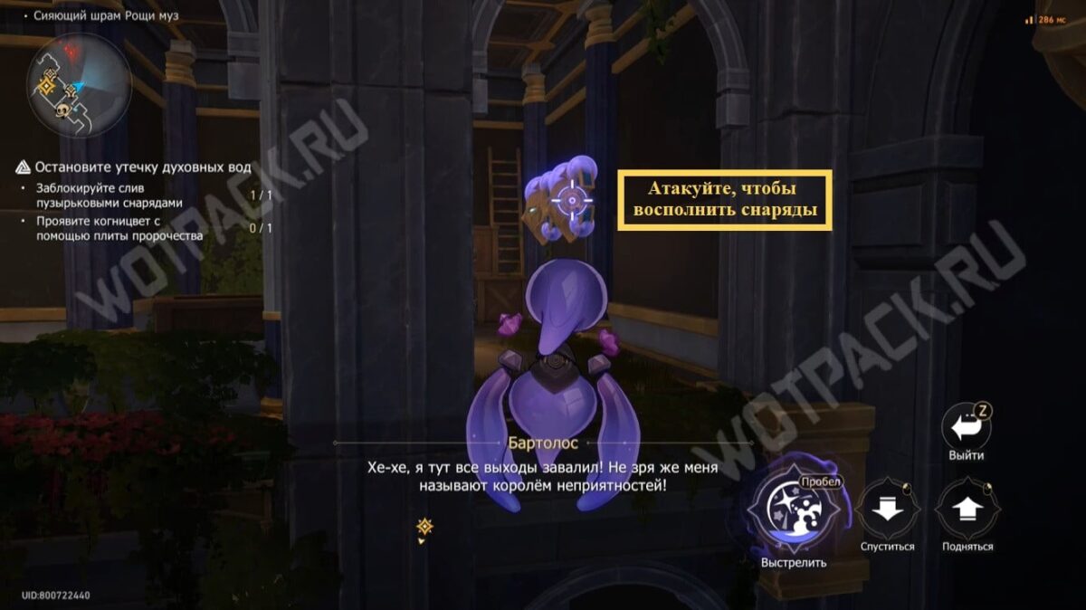 Сместите точку обзора на слив и непрерывно нажимайте «Пробел» в направлении конструкции, чтобы заблокировать утечку. Если заряды заканчиваются, восполните их, выстрелив в пузырьковые сферы в форме щитов.