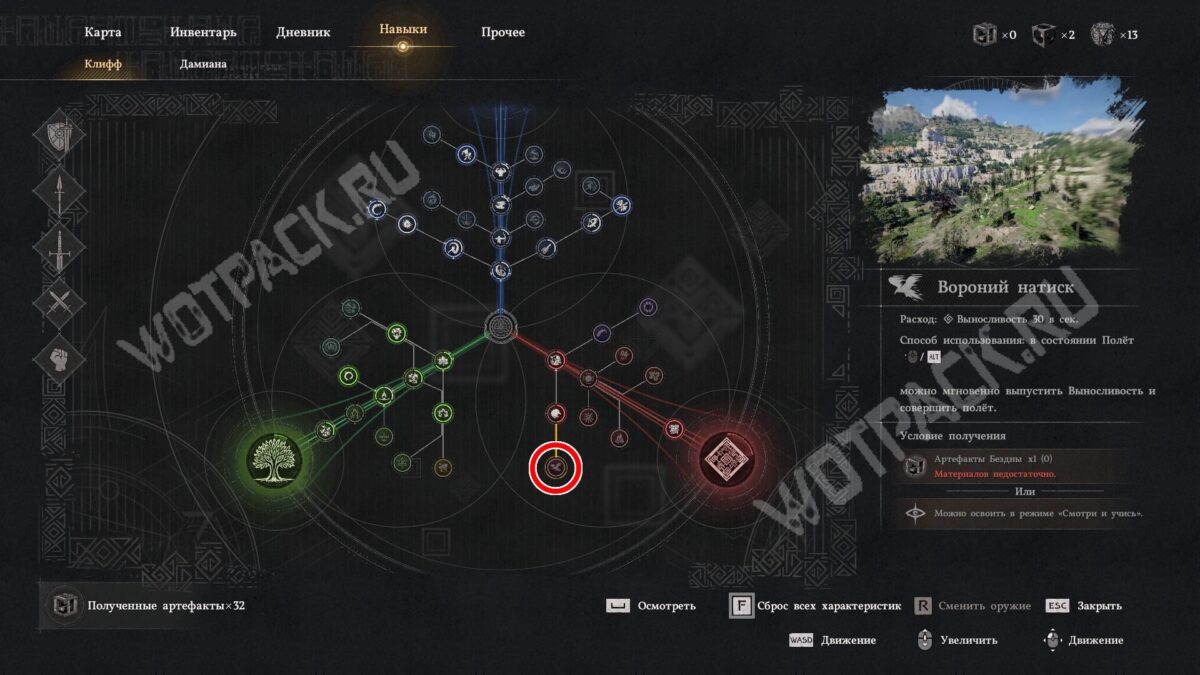 - Если битва кажется сложной, изучите навык «Вороний натиск» в красной ветке — он позволит совершать рывки-уклонения в полёте. Позже по сюжету этот скилл открывается без траты артефакта, но разблокировка на этом этапе может быть полезна для лучшей манёвренности.