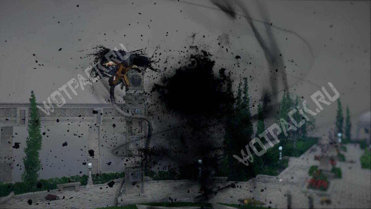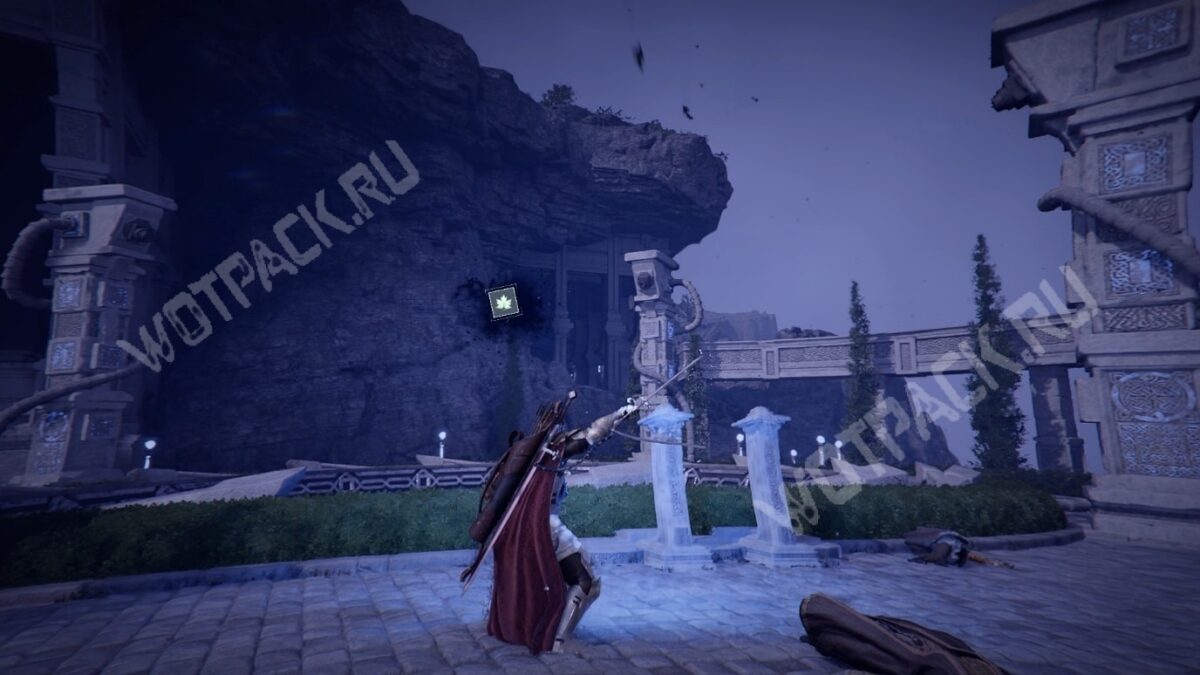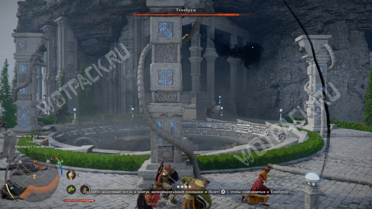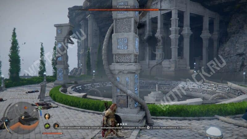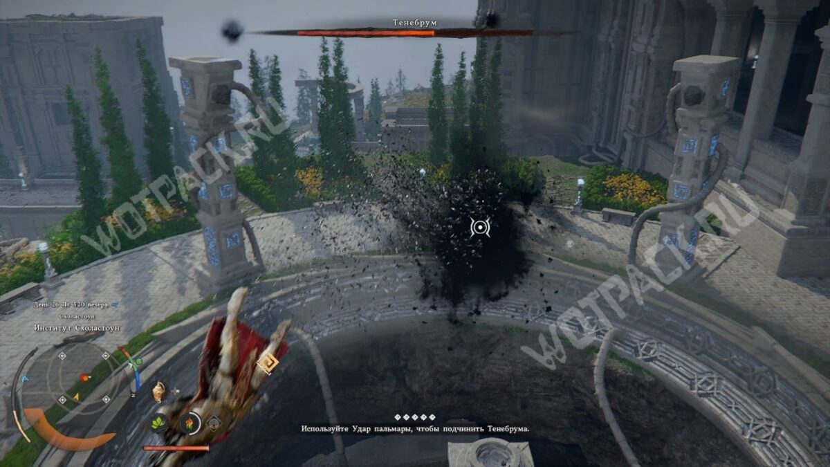 Скорее всего, к этому моменту Тенебрум зарядит свою мощную атаку и отбросит персонажа на землю. Сразу бегите за колонну и ждите следующего удобного момента, чтобы повторить связку действий. После ещё двух ударов пальмары существо будет повержено, и запустится сюжетная кат-сцена.