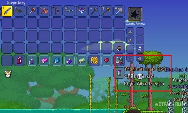Последний способ – некая лотерея. Если очень много рыбачить, то можно выловить золотой или титановый ящик, являющийся лут-боксом. Держа предмет в инвентаре, нажмите на него правой кнопкой мыши, чтобы открыть. С шансом в 2% из контейнера может выпасть Зачарованный меч.