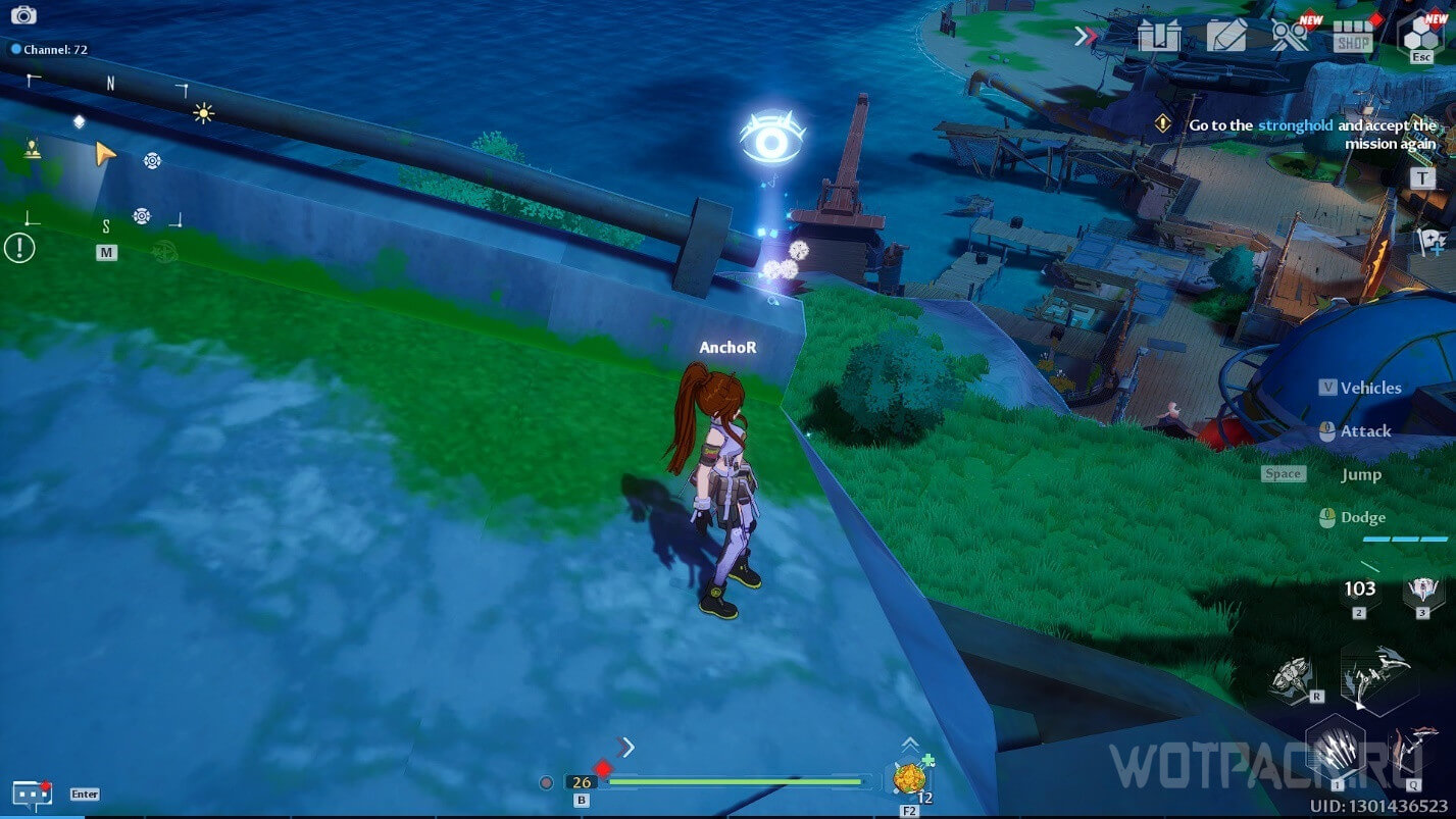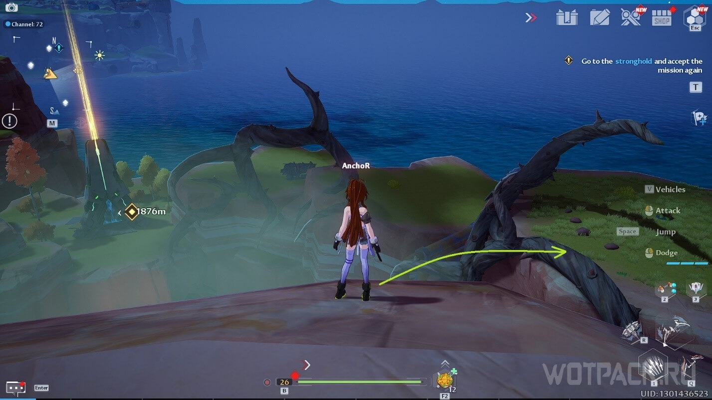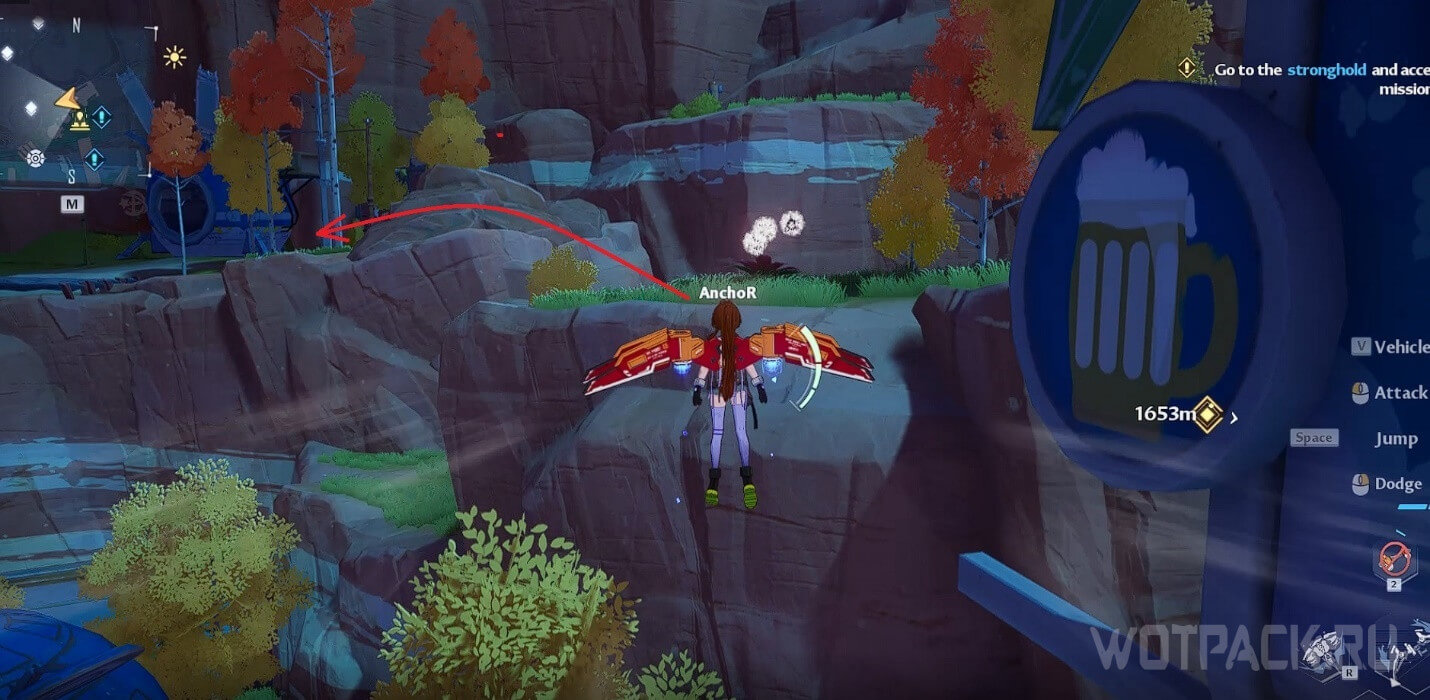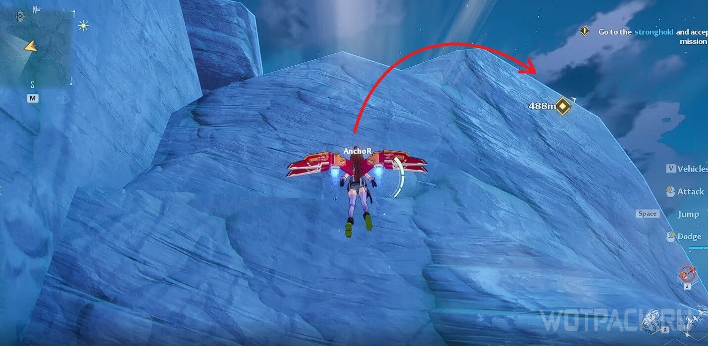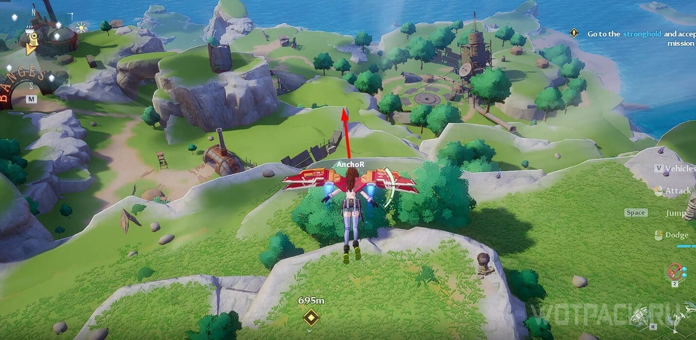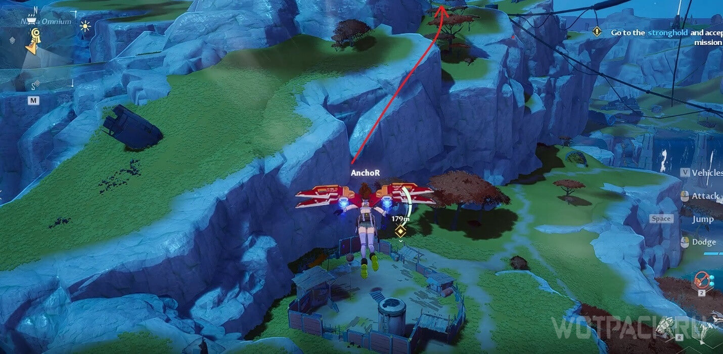 Телепортируйтесь к Omnium Tower: Banges, развернитесь налево и парите вперед до отмеченного красной стрелкой выступа. Персонажу может не хватит выносливости поэтому следите за стаминой, чтобы не упасть и не потерять ХП.