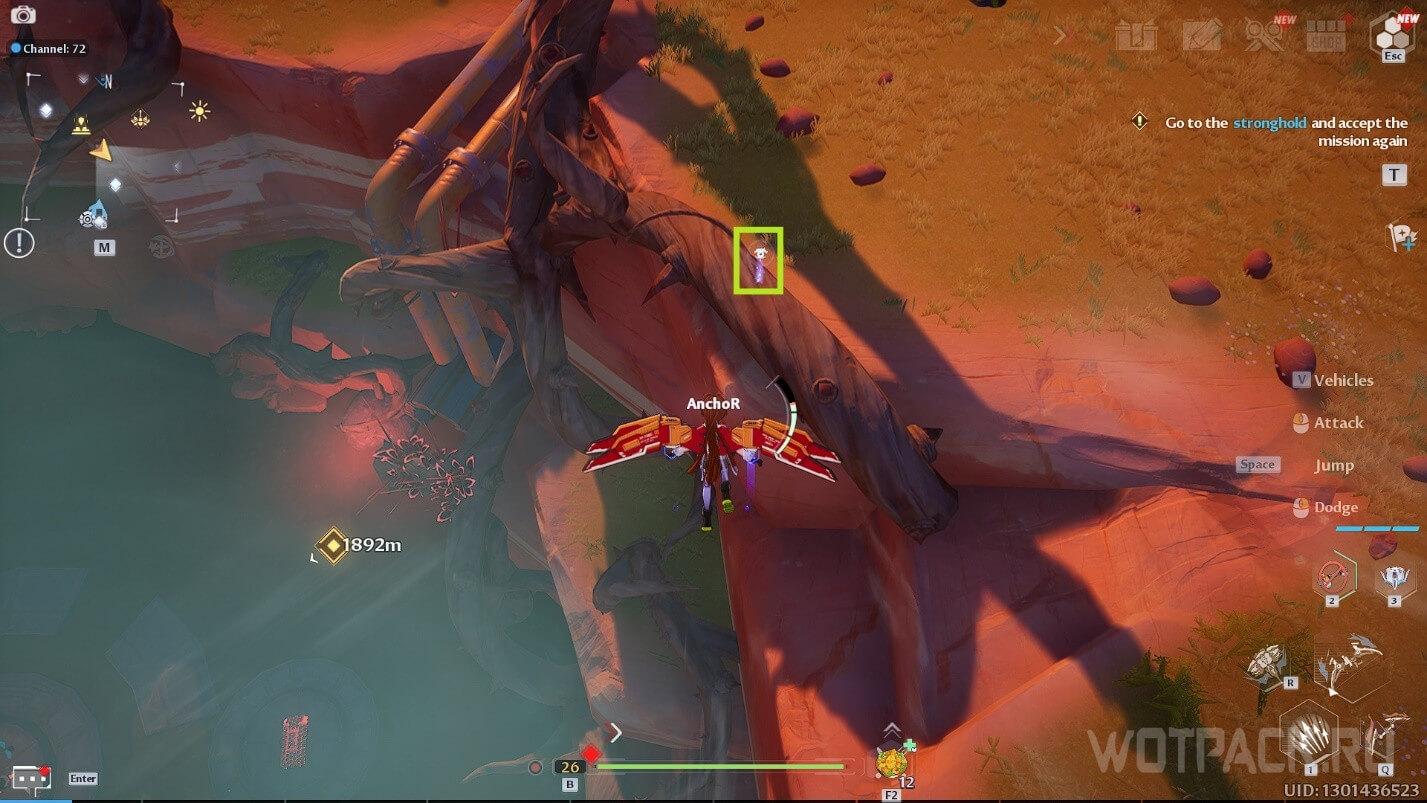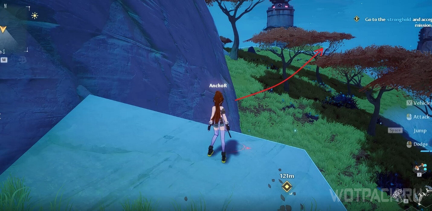 С равнины необходимо спрыгнуть на отмеченный на скриншоте каменный выступ и подойти к его краю: там обнаружите маркер.