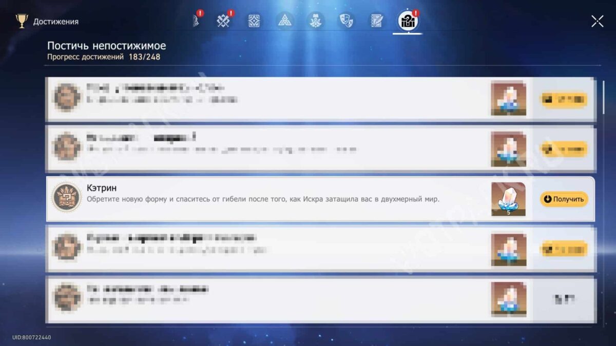 Обретите новую форму и спаситесь от гибели после того, как Искра затащила вас в двухмерный мир, — так откроете ачивку «Кэтрин» из категории «Постичь непостижимое». Вознаграждение: звёздный нефрит ×5.