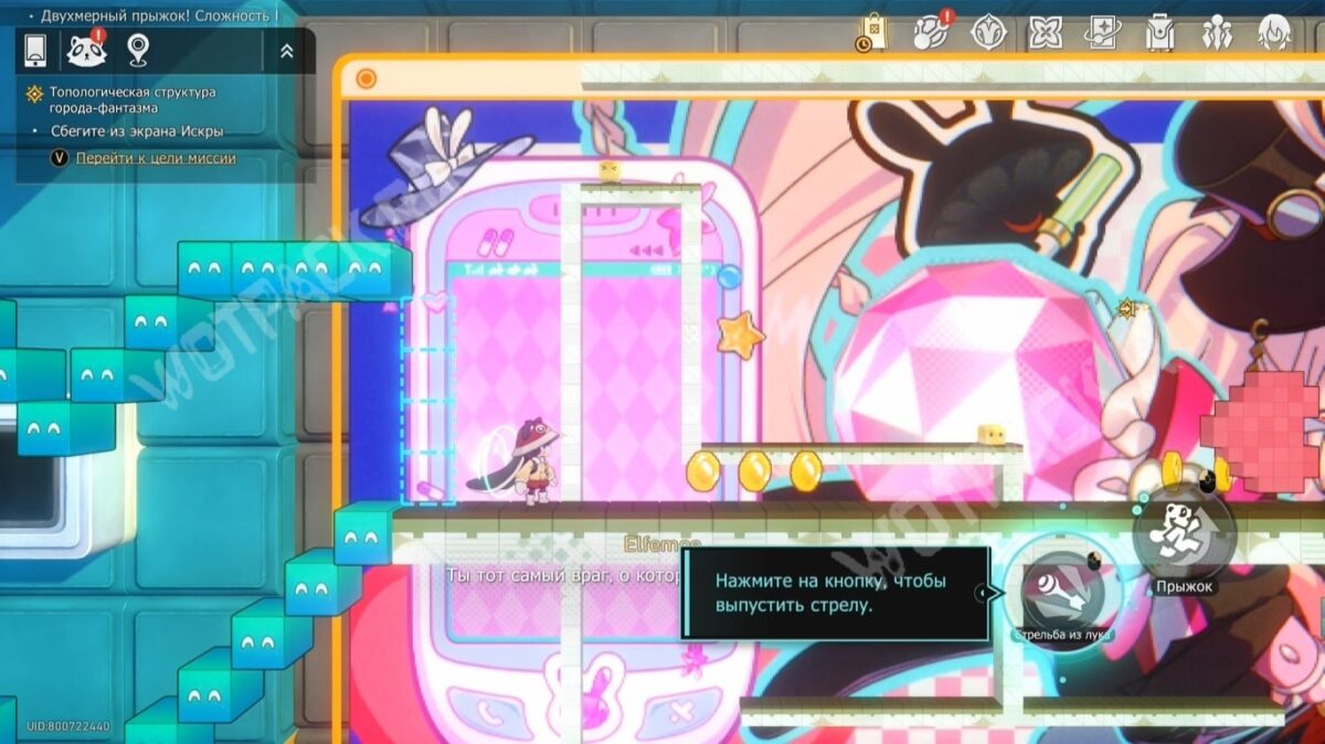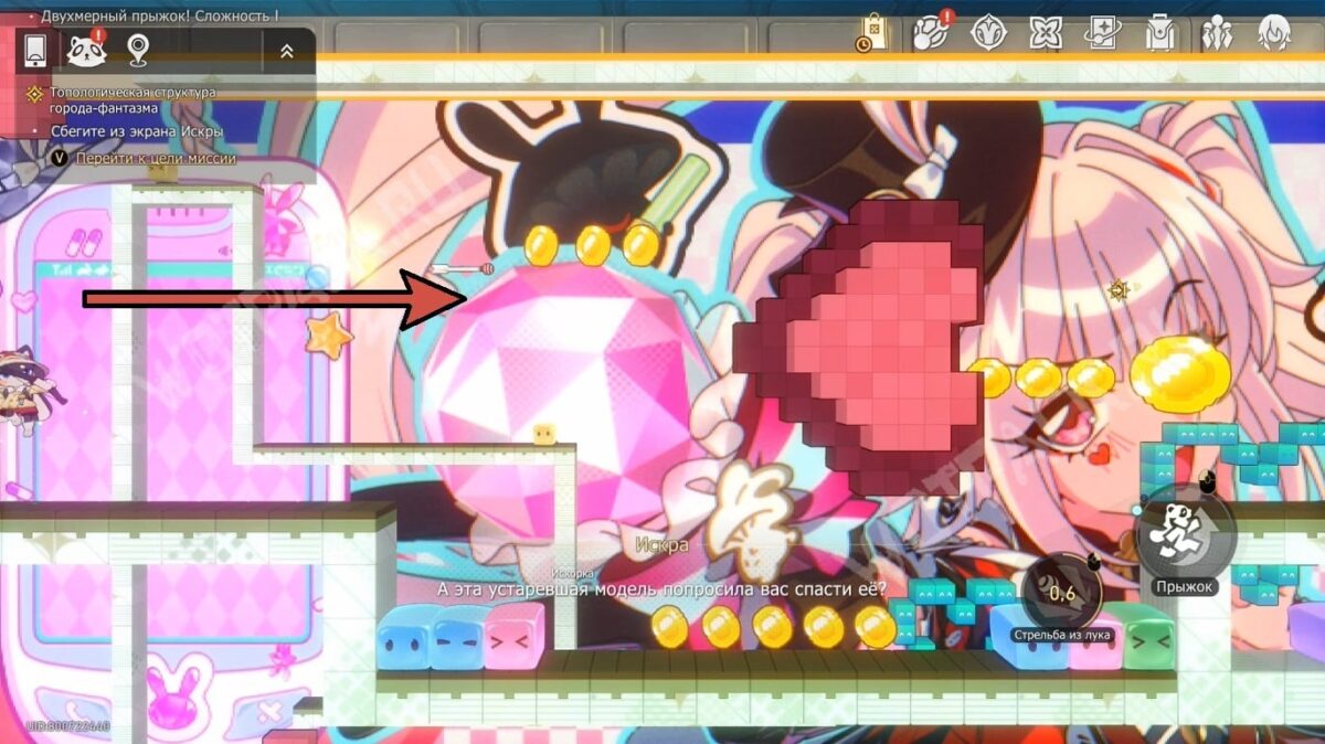 После кат-сцены попадёте в Рисованный мир «Двухмерный прыжок! Сложность 1», где откроете новую способность — стрельбу из лука (по умолчанию «ПКМ»). С помощью этого оружия сможете разрушать движимые преграды в форме сердечек, а также собирать пиксоны, парящие высоко.