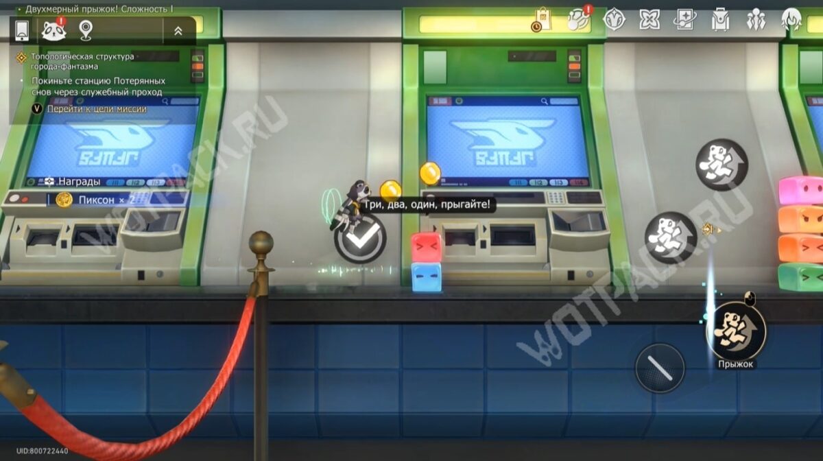 У выхода увидите толпу восторженных фанатов. Обратитесь за помощью к начальнику станции Мяуке и пройдите к служебному проходу «Двухмерный прыжок! Сложность 1». Так попадёте в Рисованный мир, где нужно собирать пиксоны и преодолевать различные препятствия:
