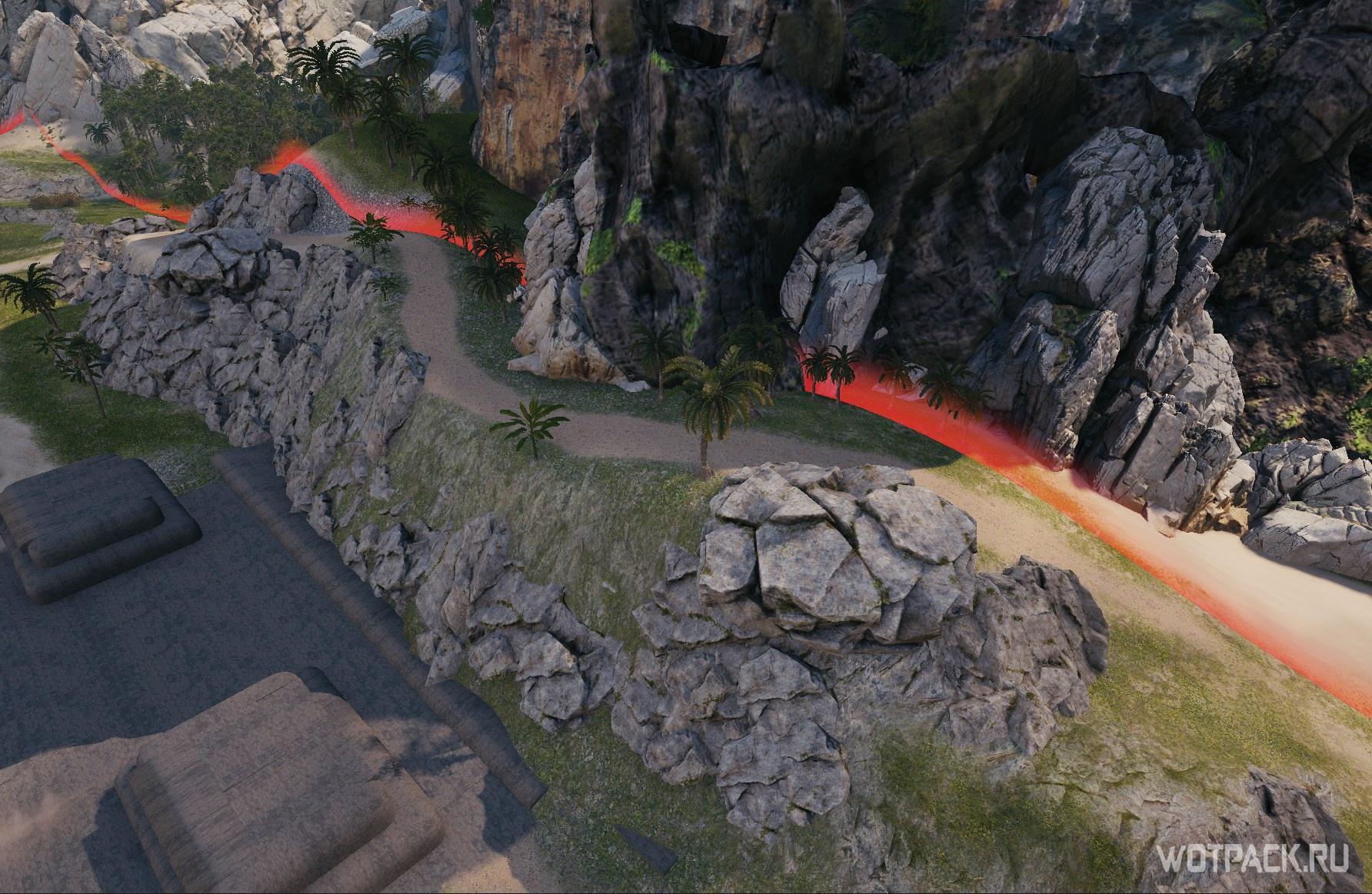 «Тропа смерти» для смельчаков, кто ищет легкого пути на вражескую базу. Нечто похожее мы имеем на карте Ласвиль, но без озера. Укрытия есть, но за ошибку придется дорого поплатиться, так как это направление простреливается с базы и центра карты.
