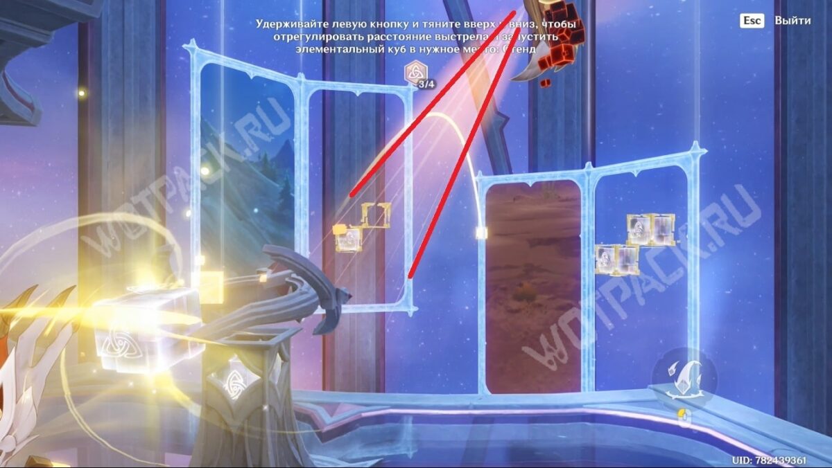 - Если элементальный кубик попадёт в зону действия этого красного луча, прогресс испытания сбросится — третий этап придётся проходить заново.