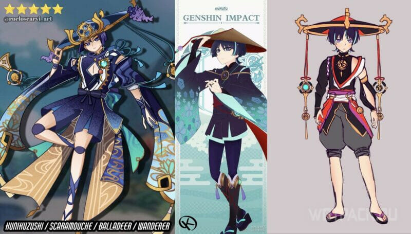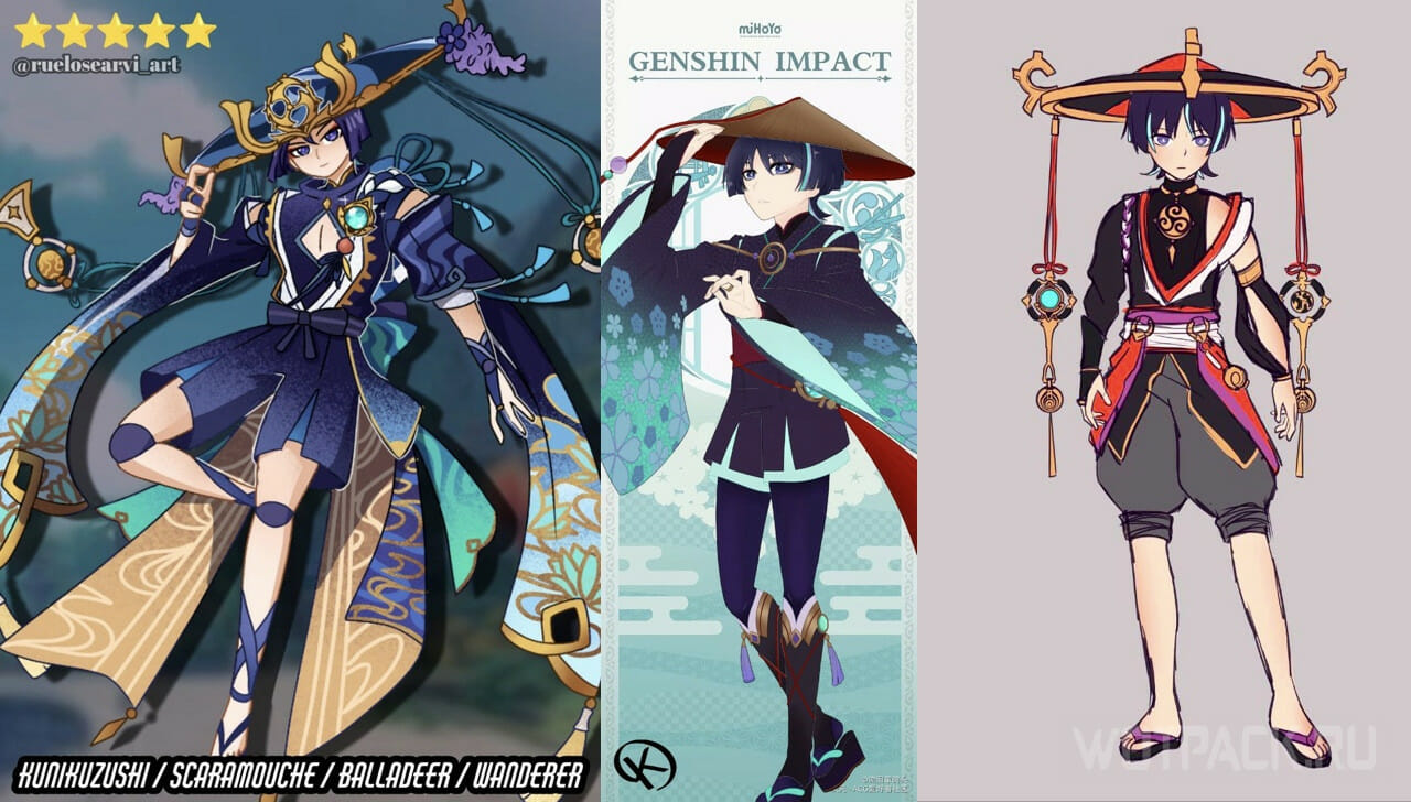 Есть немного информации и о внешности Странника. Цвета его костюма из черных станут более синими, с переходом в бирюзовый. Глаз Бога расположен на левой стороне и предположительно закреплен на кимоно у груди. Шляпа похожа на оригинальный дизайн, но станет более голубо-фиолетовой, а вуаль уберут.