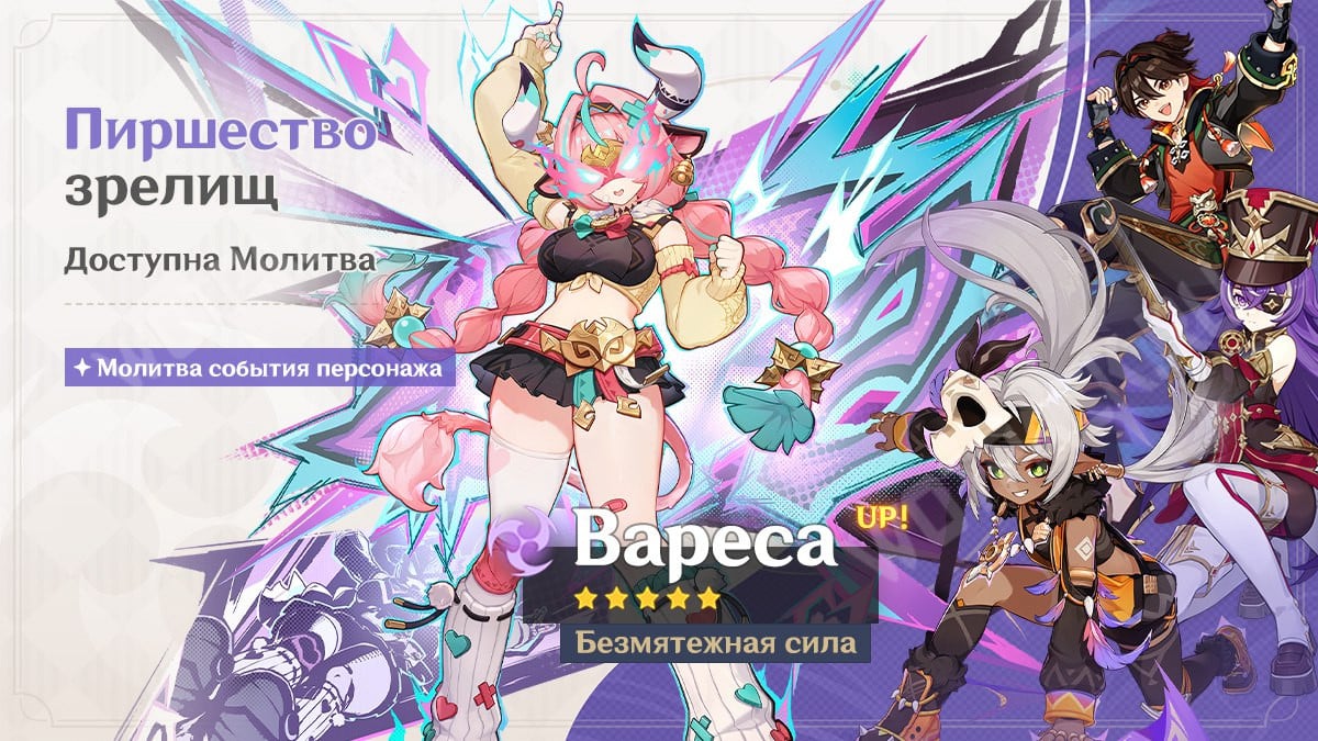 Из молитв события персонажей, где главными 5⭐ героями выступят Вареса (Электро, катализатор) и Шилонен (Гео, одноручный меч), повышен шанс на следующих эпических компаньонов: