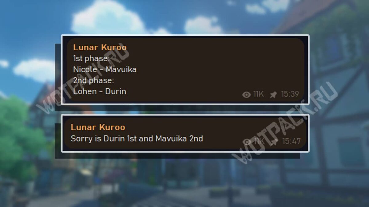 Составлено чётко по Витым Безднам. Дурин — в первом этапе из-за Сверхтяжёлого сухопутного крейсера: Мобильная крепость (Этаж 12, Зал 1, Первая половина) в Майской Бездне, а Мавуика — во второй из-за Говорящей с духами отшельницы (Этаж 12, Зал 3, Вторая половина) в Июньской Бездне. Может поэтому и Лоэна агитируют в стандартку по аналогии с Тигнари, где его баннер был с рераном Чжун Ли в 3.0?
