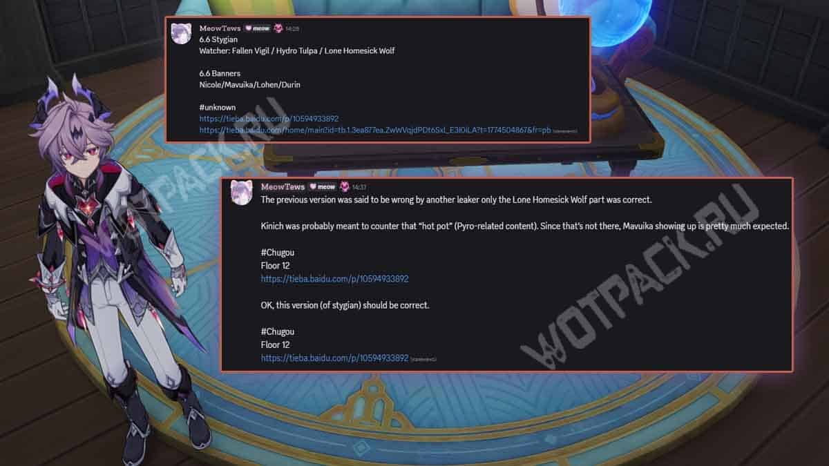 В сообществе Columbina Mains перевели новый пост Chugou, в котором он пересмотрел свою теорию о следующих молитвах в Genshin Impact. Изначально инсайдер предполагал, что в обновлении 6.6 вернут Кинича (Дендро, двуручное) из-за Статуи лавового дракона в Мрачном Натиске. Теперь, по его словам, вместо голема планируется подвижный Гидро босс, поэтому возможен реран Дурина (Пиро, одноручное).