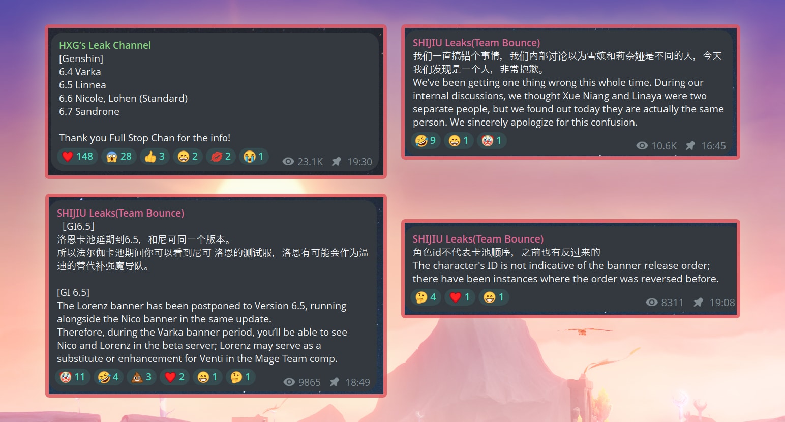 - 6.5 — зоолог Линнея как единственная героиня Луны 6, а значит она должна быть 5⭐. Тот же сливер говорил о Снегурочке в этой версии, следовательно они могут являться одним и тем же персонажем.