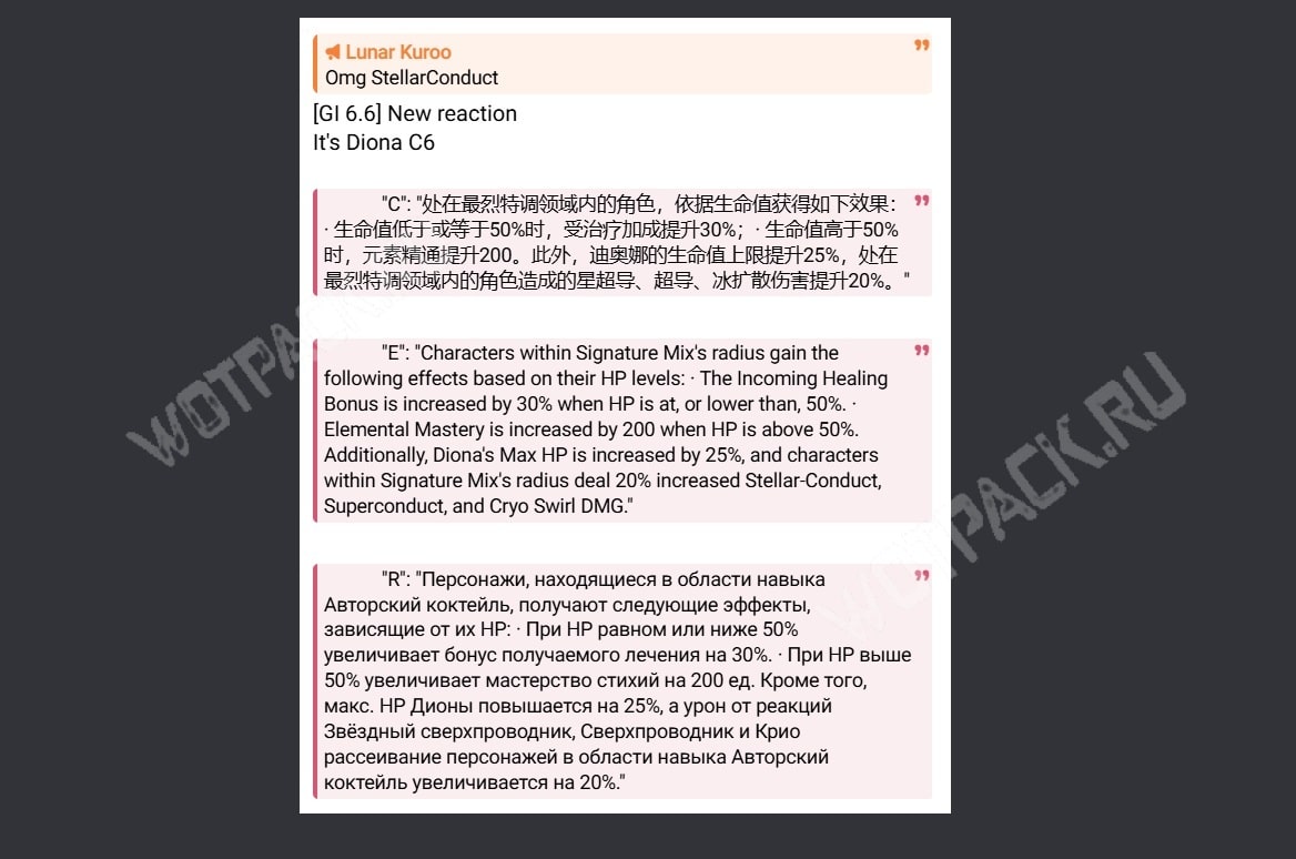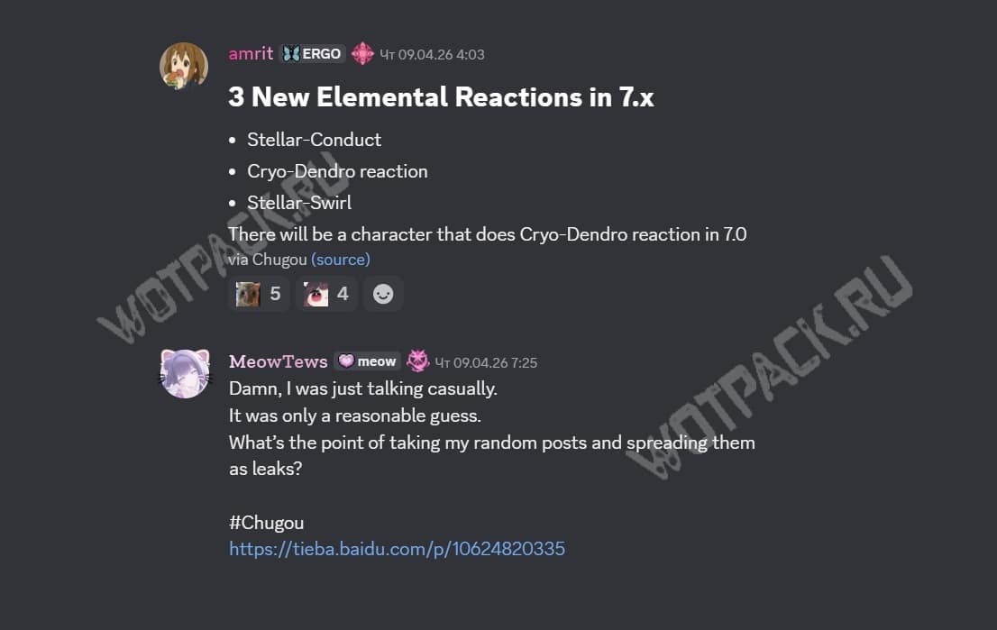 На фоне этого также разошлось сообщение с упоминанием других Звёздных реакций и релизом в патче 7.0 героя, играющего от взаимодействия Дендро и Крио. Однако оно оказалось лишь предположением с китайского форума одного из пользователей Chugou, а не инсайдом от какого-то сливера, поэтому не стоит на него опираться.