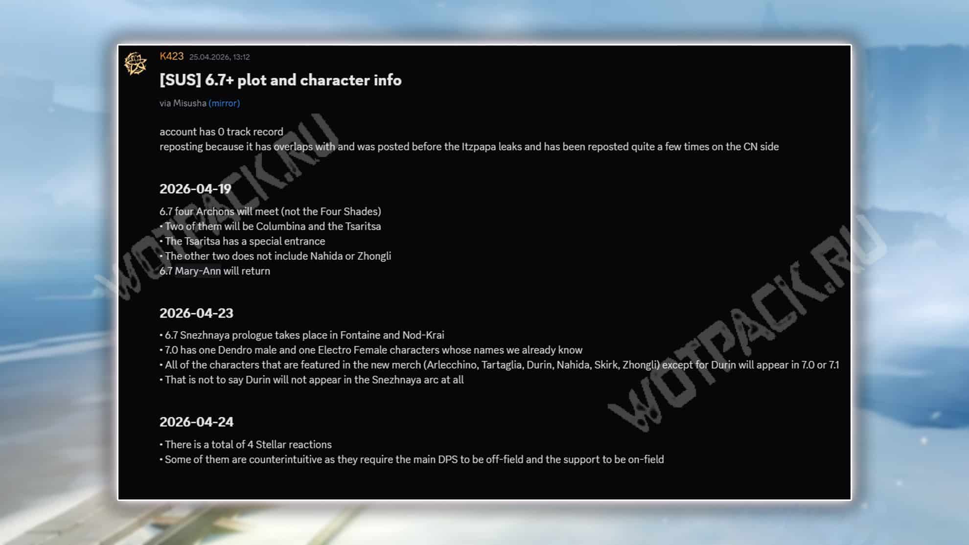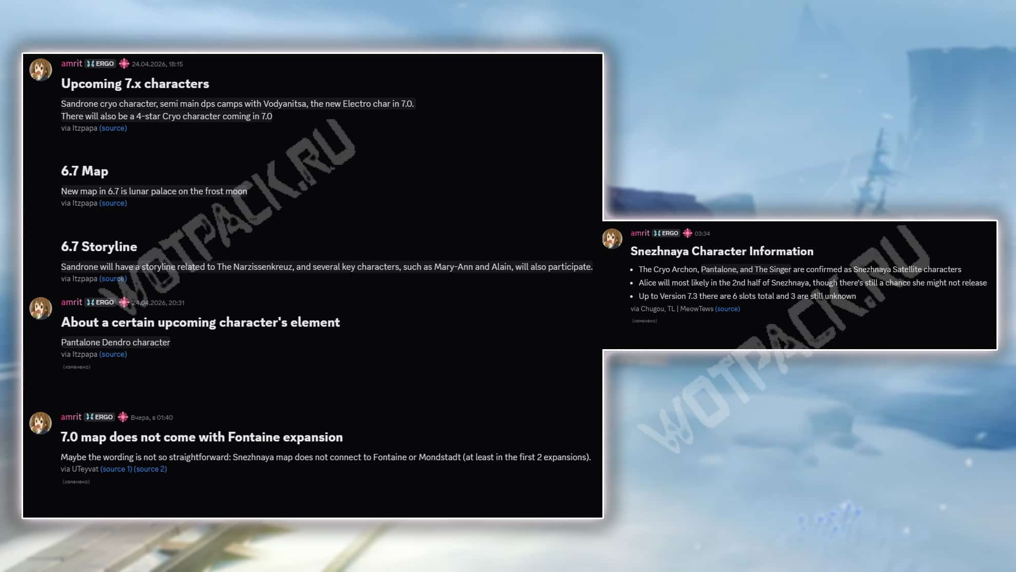 После официального представления будущего региона разработчиками Genshin Impact количество сообщений от инсайдеров резко возросло. Анонимные и уже известные надежные источники стали чаще публиковать информацию, относящуюся к холодным землям Снежной, её сюжету, персонажам и даже предшествующим релизу событиям.