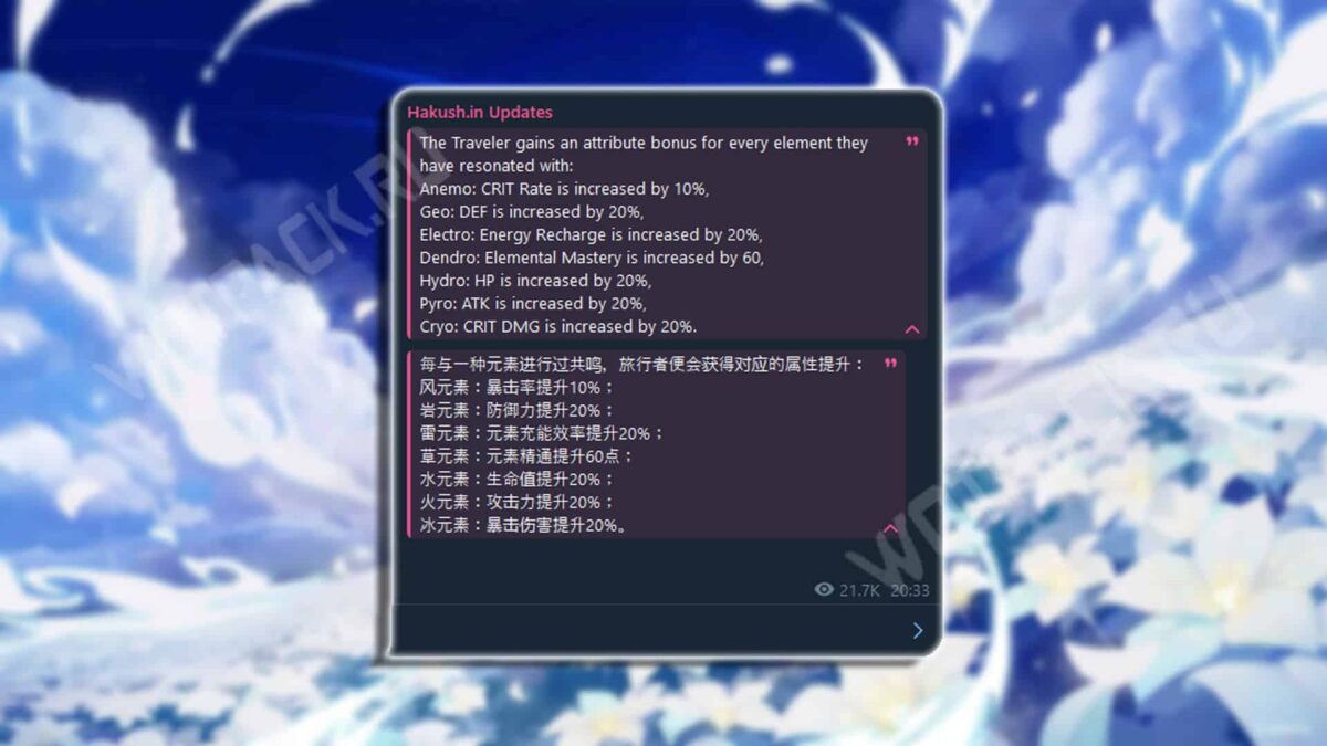 По данным источника, в зимнем патче 6.3 главный герой сможет открыть новые пассивные эффекты. Определенный бонус будет открываться за каждый элемент, с которым когда-либо резонировал персонаж. Все прибавки складываются и действуют для ГГ любой стихии: