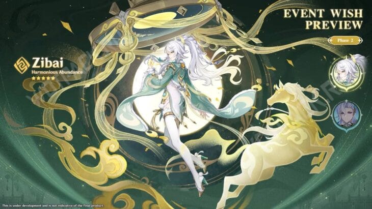 - Вторая фаза (с 3 по 23 февраля) — Цзы Бай (Гео, одноручный меч) и повтор юдекса Невиллета (Гидро, катализатор). В этой же части станет доступен эпический Иллуги (Гео, копьё), который является сигнатурным саппортом под Адепта.