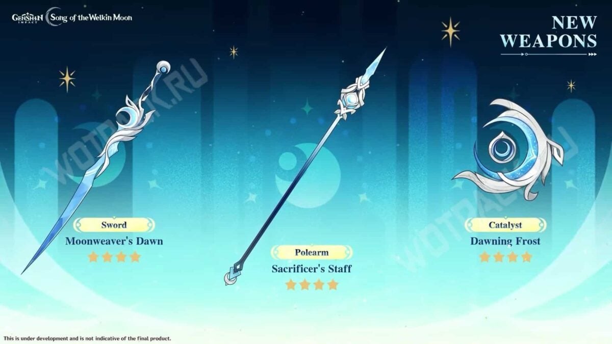 В оружейный баннер первой фазы войдет сразу три 4⭐ вооружения в стиле Нод-Края: меч Рассвет прядильщицы луны, копье Посох жертвующего и катализатор Рассветный иней.