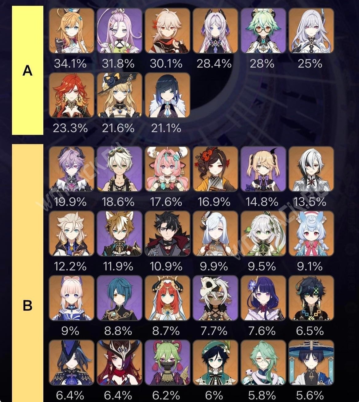 В среднем тире уверенно держится ядро команды от Заморозки в лице шефа Эскофье (34,1%) и воительницы Скирк (25%), а также другие герои, способные вписаться в отряды нод-краевских мейн-дд. Чуть меньше четверти игроков всё ещё предпочитают Пиро Архонта Мавуику (23,3%). Вероятно, дело в её личной силе, которая перекрывает все блоки чудовищ и недостаток направленных баффов.
