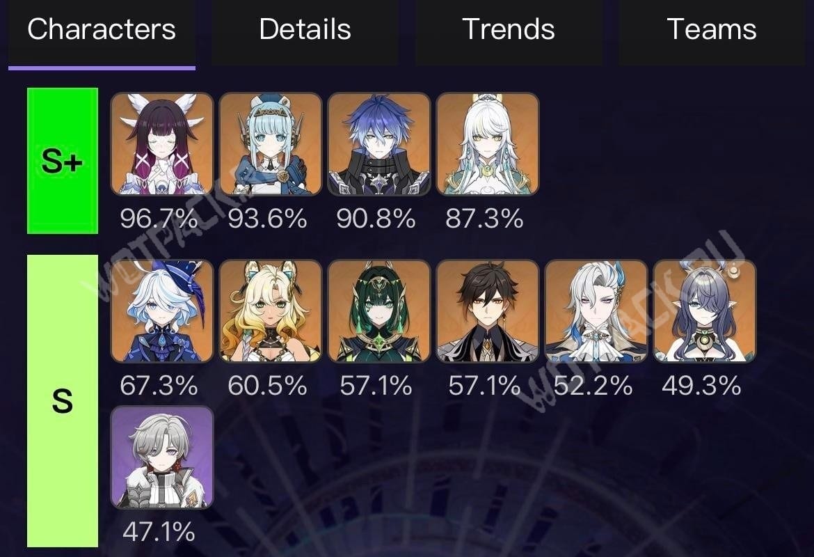 Чуть меньшим успехом у игроков пользуется связка жрицы Лаумы (49,3%) и босса Нефер (57,1%), составляющих основу Лунной бутонизации. Гидро Архонт Фурина (67,3%) и кузнец Шилонен (60,5%) держатся на очень высокой позиции, хоть и слабо вписываются в игру с нод-краевцами. Из-за добавления Цзы Бай возросла популярность Архонта Чжун Ли (57,1%), а другие обладатели Гео элемента тоже стали нужны против босса Легата големов во второй половине 12-го этажа.