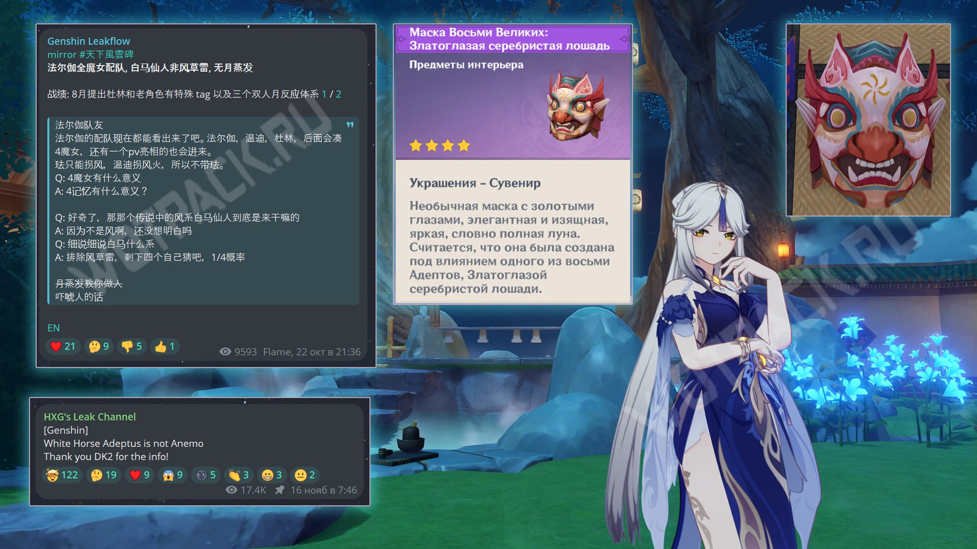 На прошлом Празднике морских фонарей среди наград были маски Восьми Великих, включая декор Златоглазой серебристой лошади. Если предмет основан на дизайне этой героини из Ли Юэ, то он больше всего похож на Пиро или Гео элемент. Однако до неё выходит огненная поддержка в виде дракона Дурина (одноручное), а после намечается дамагер Сандроне (катализатор) от «Кристаллизации». Если её стихия совпадает с кем-то из них, то с большой вероятностью роль в отряде будет отличаться.