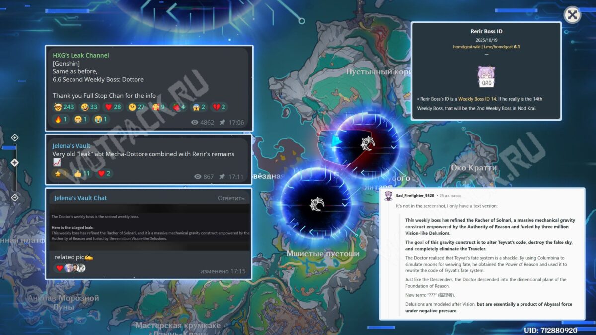 Сливер Jelena вспомнила о старом слухе: «Босс якобы является усовершенствованной формой Лунного мстителя в виде огромной механической гравитационной конструкции Дотторе, питаемой Властью Разума и тремя миллионами Глаз Порчи. Её цель — переписать код Тейвата и уничтожить фальшивое небо вместе с Путешественником. Глаз Порчи — по сути продукт силы Бездны под действием отрицательного давления».