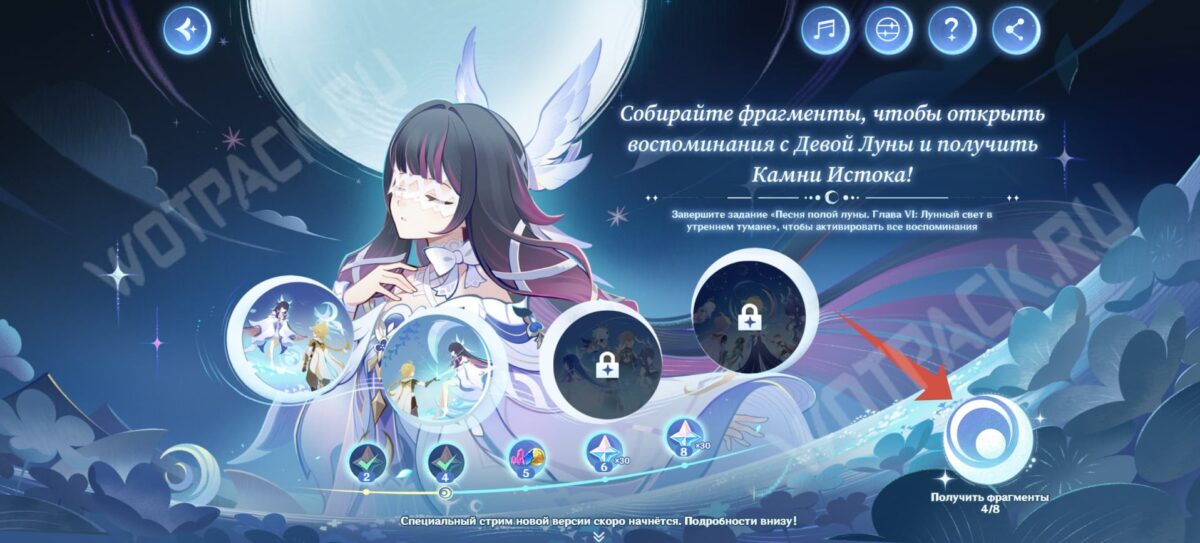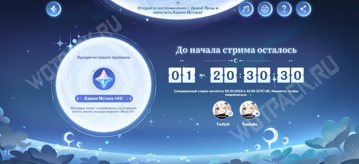 Не забудьте пролистнуть страницу вниз, чтобы узнать о времени до начала стрима 6.3 и пройти предрегистрацию. 40 камней истока пришлют не сразу, а 14 января 2026 года, после выхода самого обновления 6.3 в игре.