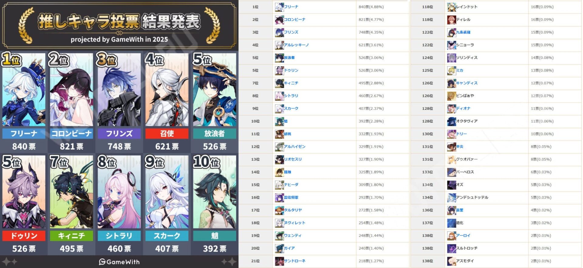 На японском сайте GameWith 20 000 пользователей проголосовали за лучшего героя 2025 года по трём номинациям: общей, а также в ролях DPS и поддержки. Самым популярным персонажем уже третий раз подряд стала актриса Фурина, а второе место заняла Коломбина Гипоселениа, релиз которой ожидается 14 января в обновлении 6.3. Третья позиция досталась светоносцу Флинсу, успевшему полюбиться многим ещё с анонса Нод-Края.