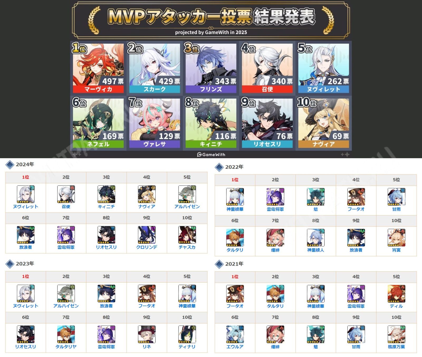 Сильнейшим дамагером посчитали Архонта Мавуику, сместившую Арлекино на четвёртую строку. На второй и третьей позиции оказались мечница Скирк и Флинс, а после них — Невиллет, занимавший первые места в 2023 и 2024 году. Рассказчица Нефер и Кинич вытолкнули из десятки аль-Хайтама.