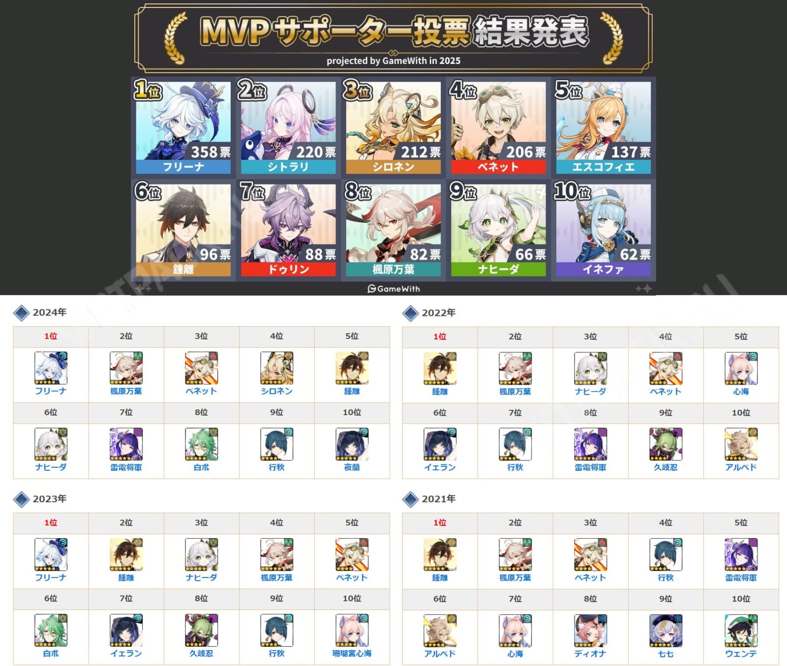 Звание лучшей поддержки третий раз досталось Фурине. Это показывает, что среди японских игроков она стала самой лучшей не только по своей истории, но и по геймплею. Из-за текущей меты и новых саппортов самурай Кадзуха упал со второй строки на восьмую, а вот приключенец Беннет и кузнец Шилонен просто поменялись местами в сравнении с прошлым годом.