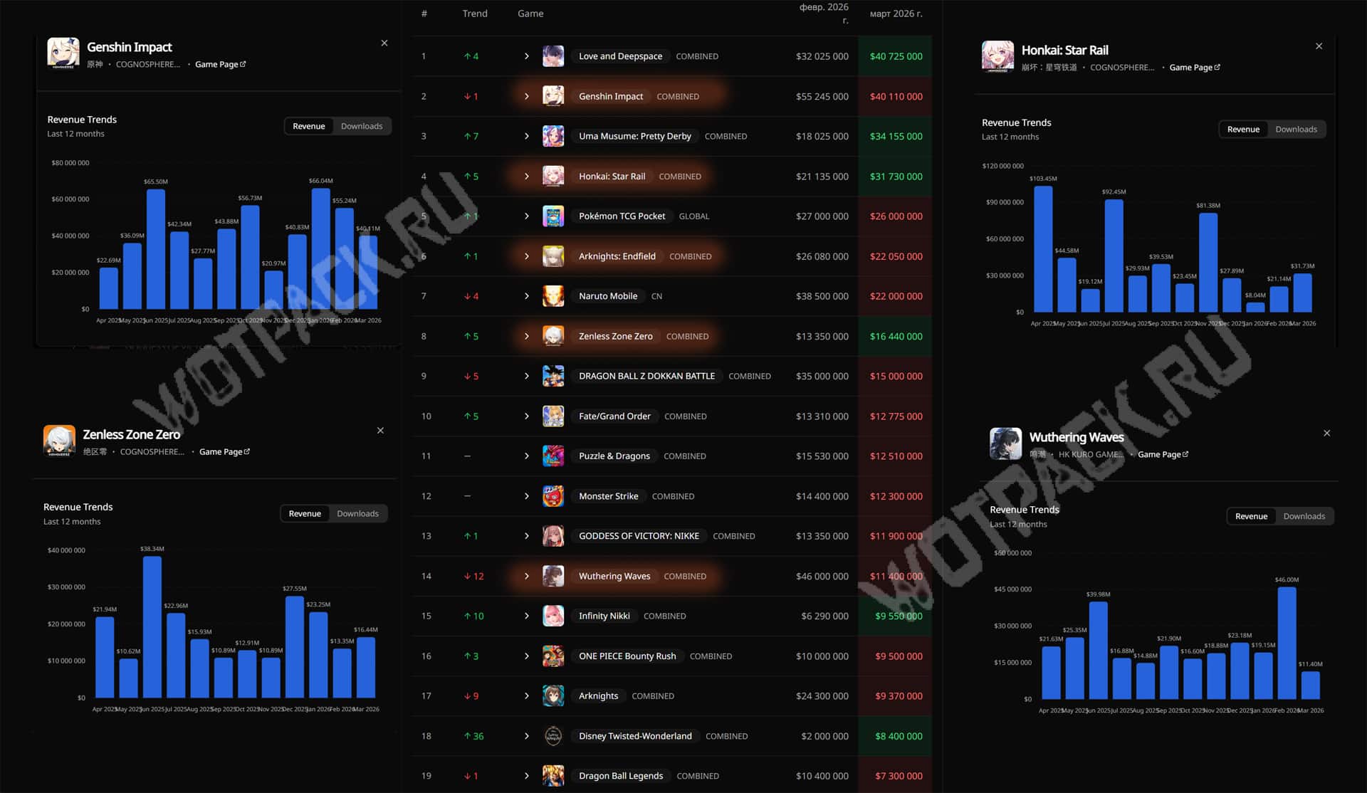 Согласно статистике сервиса GachaRevenue, Genshin Impact занял второе место по доходу среди гача-игр за март 2026 года. Первые рераны мечницы Скирк и повара Эскофье принесли проекту $40 110 000. Остальные игры HoYoverse тоже повысились в рейтинге.