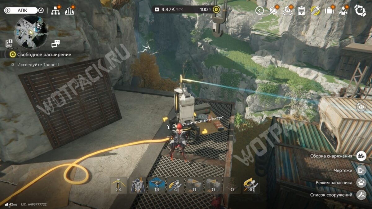 Начните передачу от последней установленной постройки и поднимитесь по тросу с кабелем. Запитайте нексус — рядом с ним активируется прыжковый батут, дающий возможность запрыгнуть на скалу.
