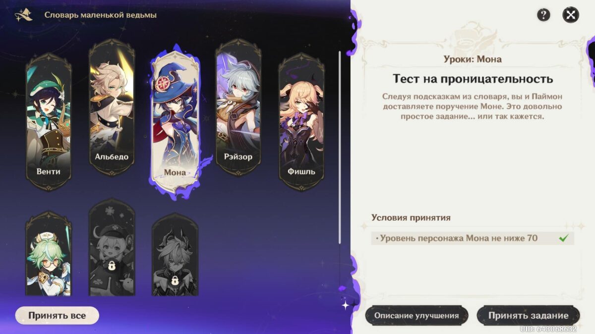Миссия «Уроки Моны: Тест на проницательность» не только повысят боевой потенциал астролога, усилив урон реакции Пар и продлив действие Омена при использовании ударов с руки, но и позволит узнать немного больше о её жизни. Подробности по баффам остальных мондштадтцев читайте в отдельном руководстве по Ведьмовству.