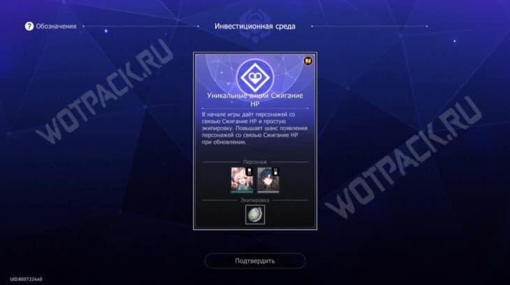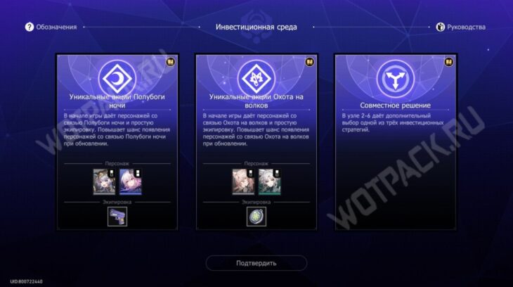 Для комфортного прохождения кампании предлагается выбор Инвестиционной среды — специального бонуса, дающего двух персонажей для формирования команды, и простую экипировку, которую можно использовать для синтеза продвинутого снаряжения. Именно на основе этого баффа будет строиться стратегия ведения битвы на уровне.