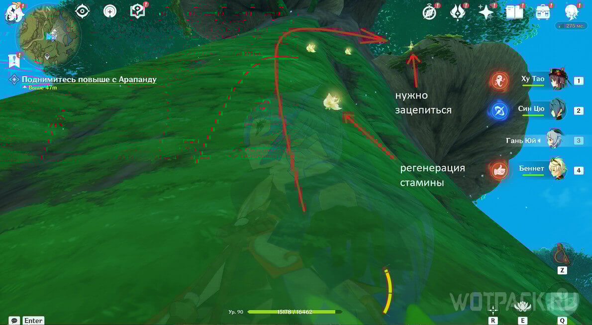 Закончив беседу, поднимитесь повыше с Арапанду. Точка, куда нужно отправиться, расположена немного западнее Чащи Апам, рядом с телепортом. Подойдя поближе, увидите огромное дерево с платформами на стволе. Если встать с южной стороны, то на коре обнаружите светящиеся цветочки, которые восстанавливают выносливость. Заберитесь до второго бутона, после чего отцепитесь и залетите наверх с помощью четырехлистного символа.
